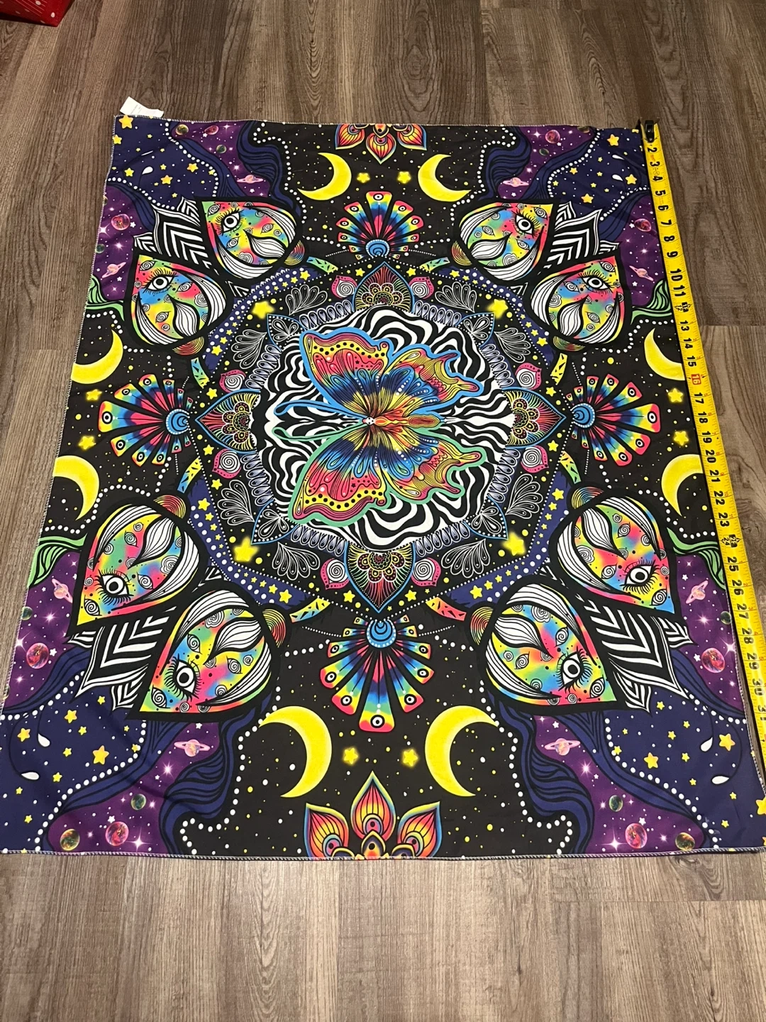 Add a touch of cosmic flair to your space with this vibrant mandala tapestry! Measuring approximately 35 inches by 28 inches, it's perfect for adding a pop of colour and unique design to any room