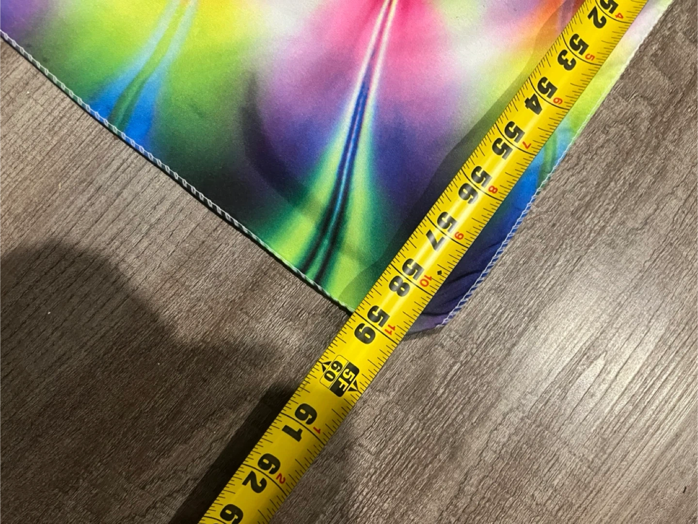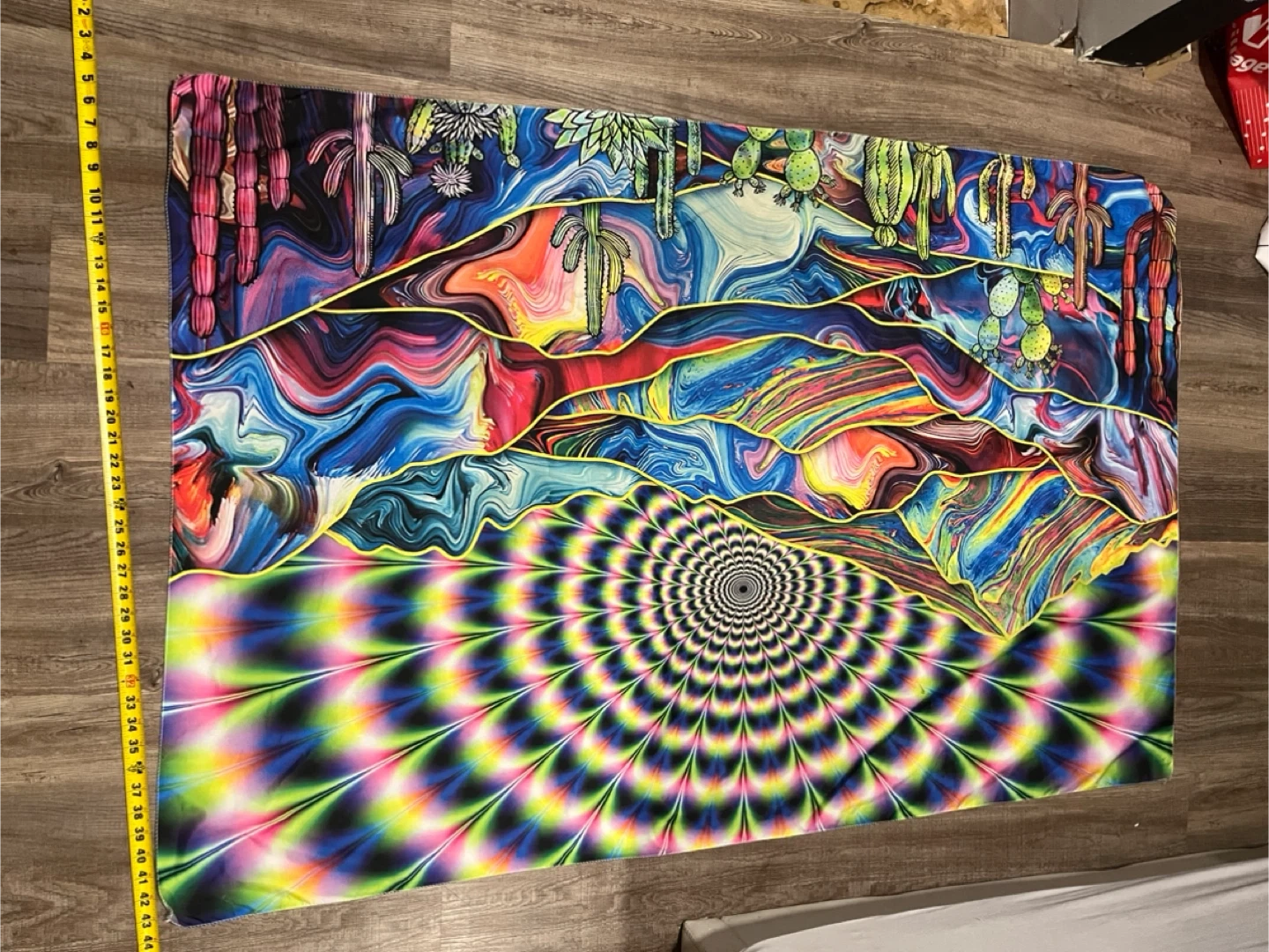 This vibrant tapestry is sure to add a pop of colour to any room! It features a unique and eye-catching design. The tapestry measures approximately 60 inches by 44 inches, making it a great size for a wall hanging or even a throw blanket