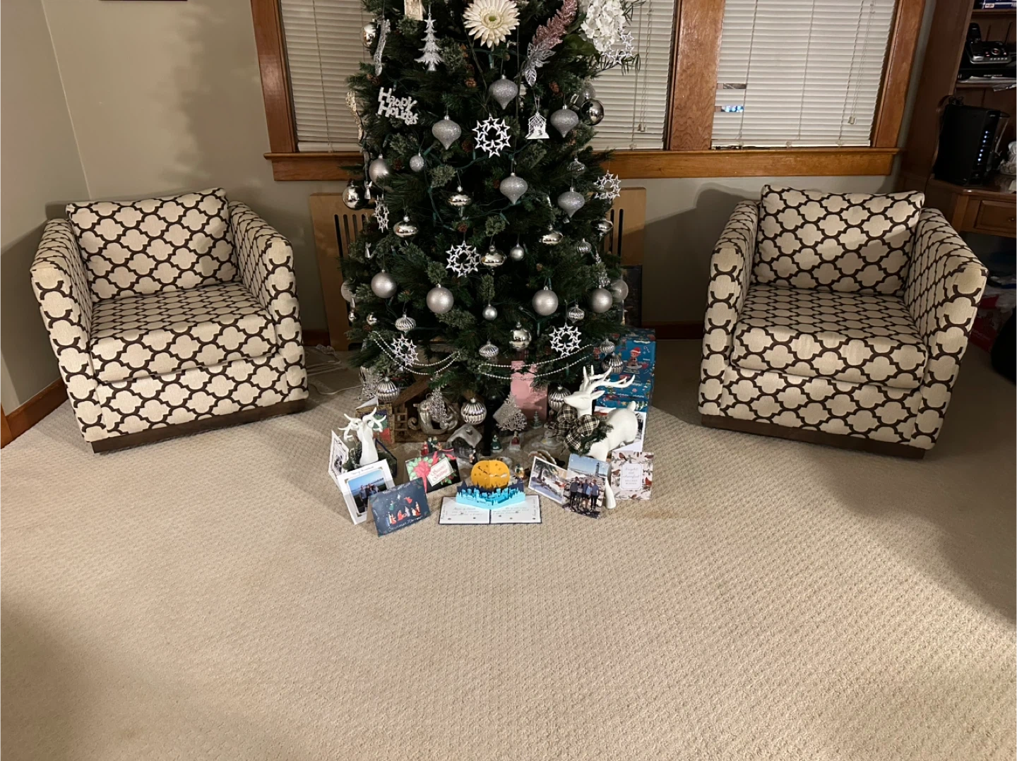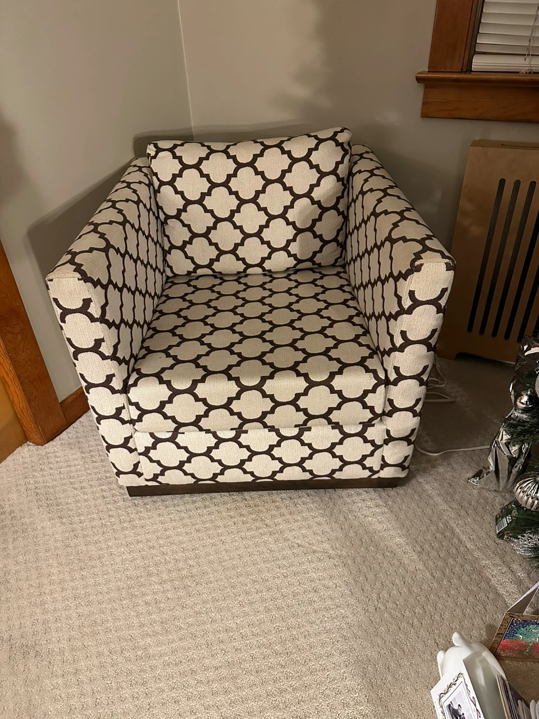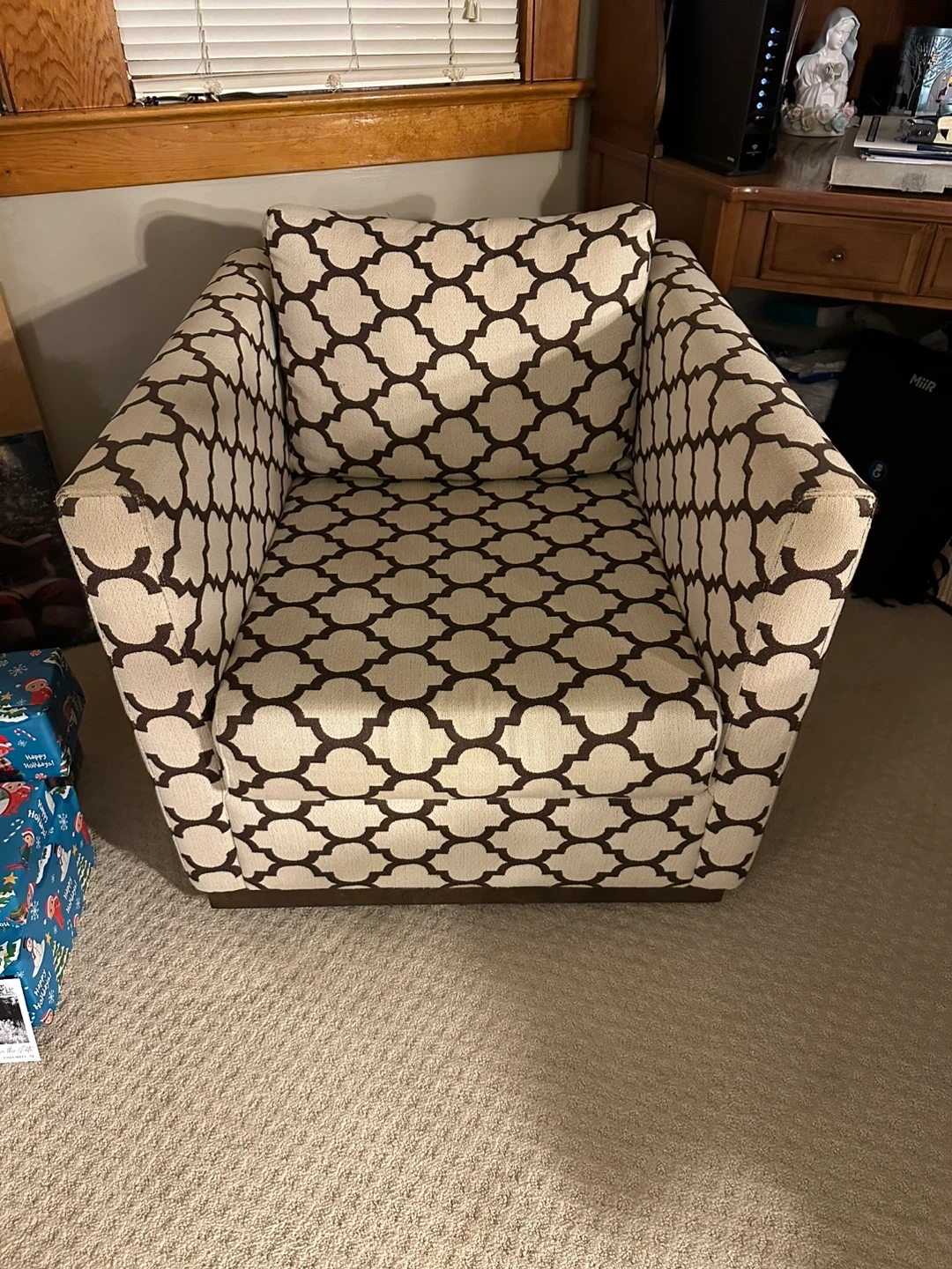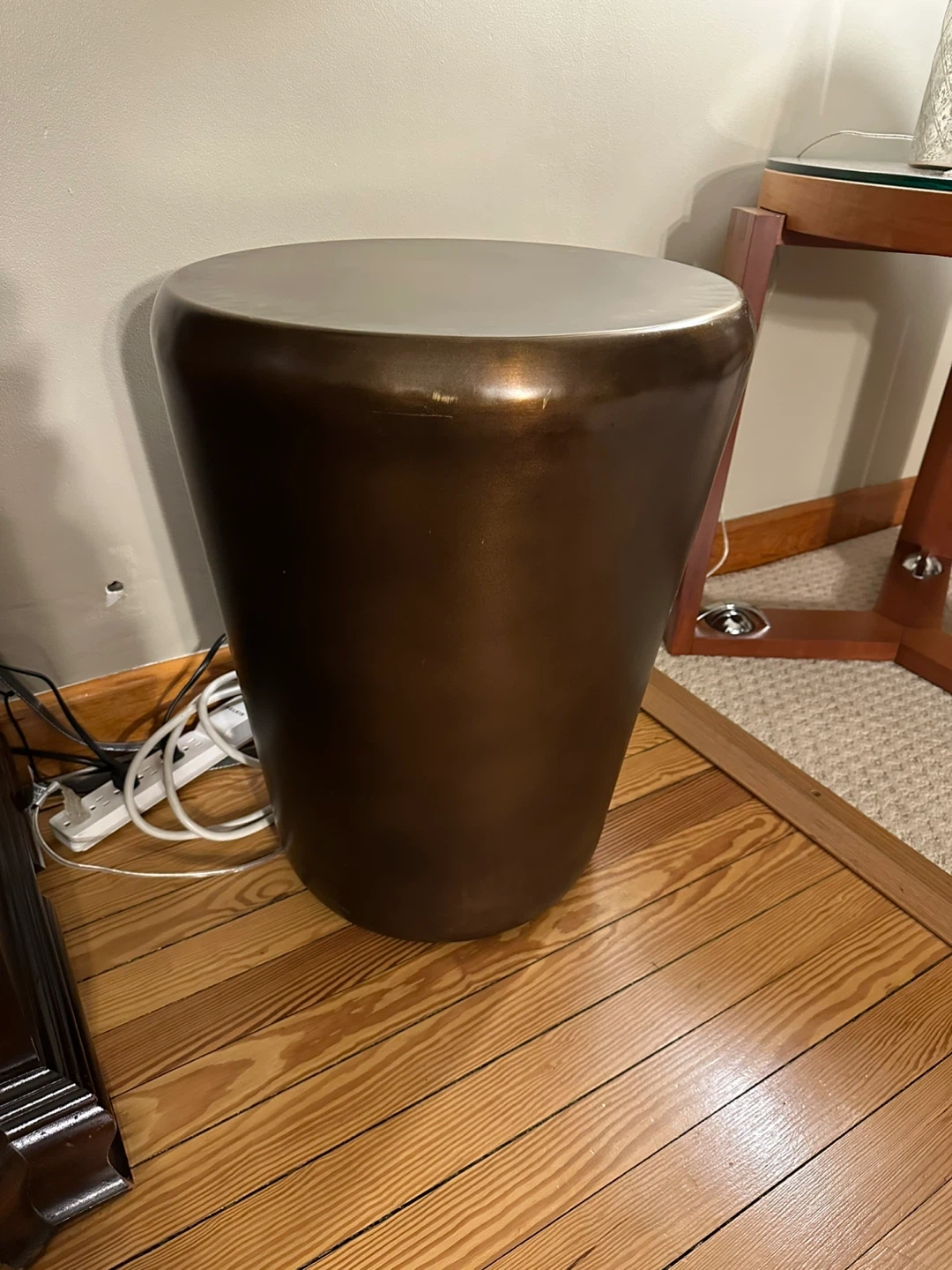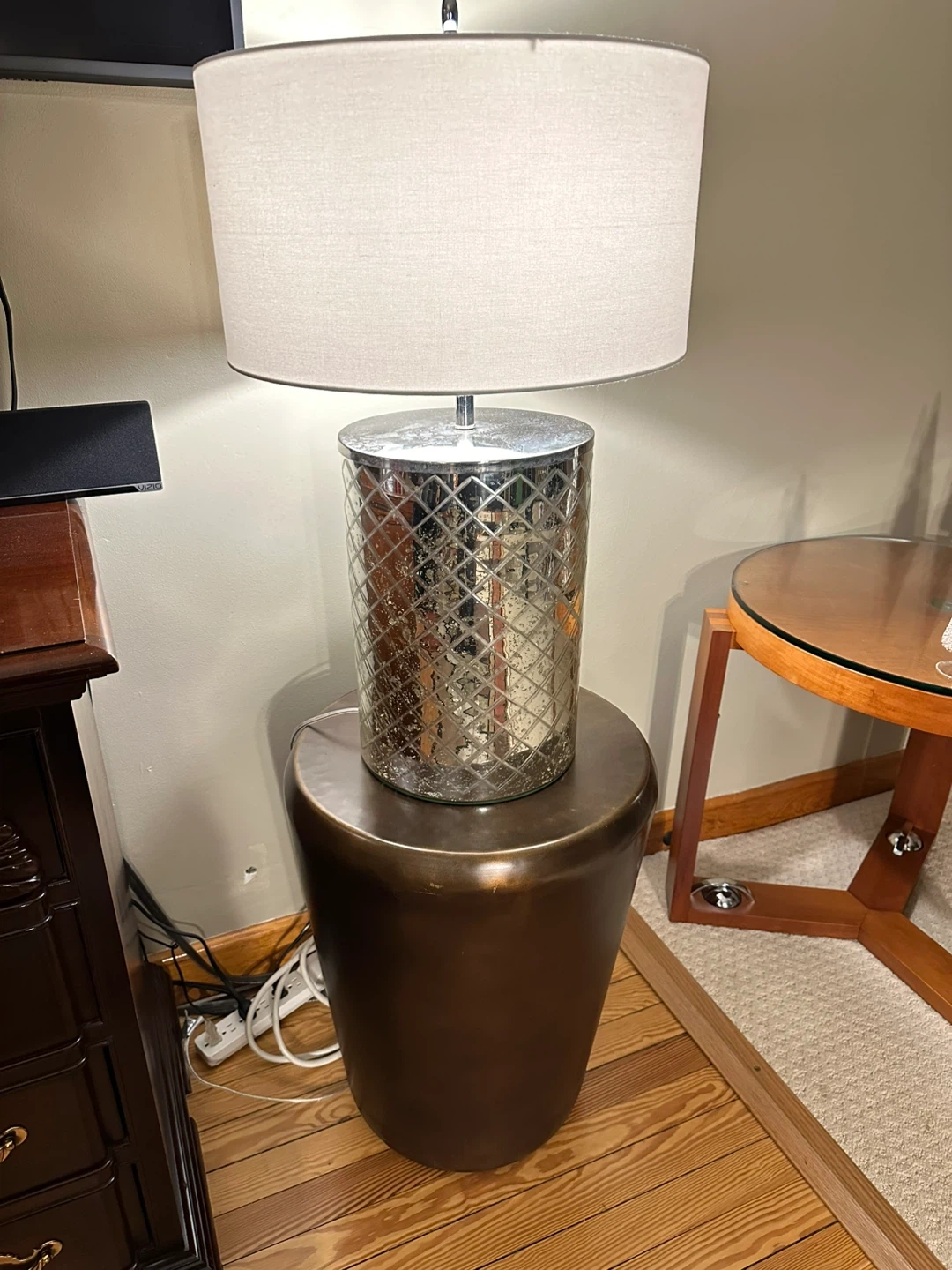 Selling a stylish accent table paired with a decorative lamp. The table features a unique bronze finish, and the lamp has a textured silver design. Perfect for adding a touch of elegance to any room with 2 chairs