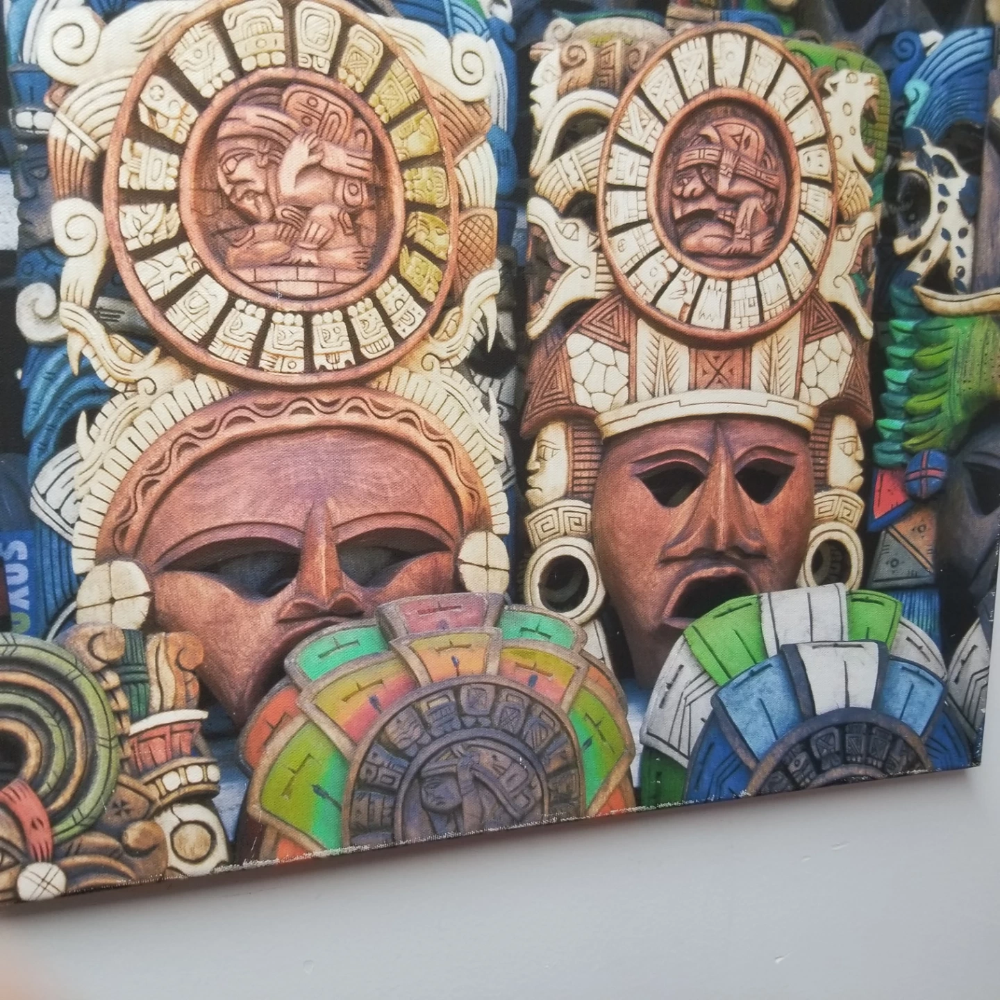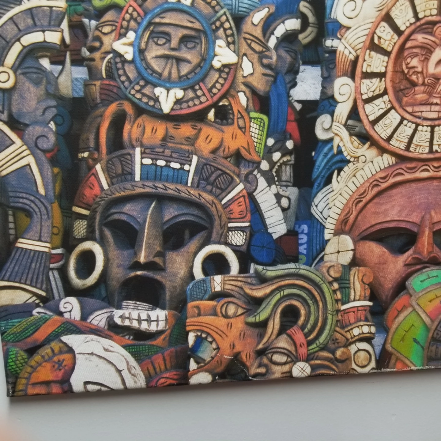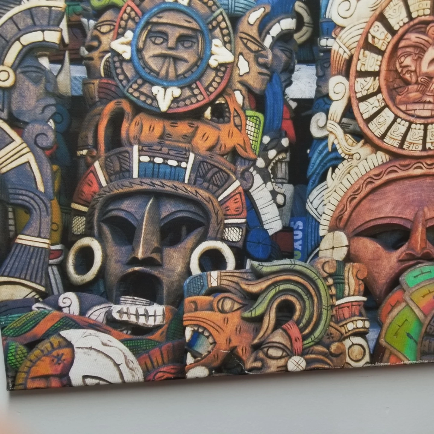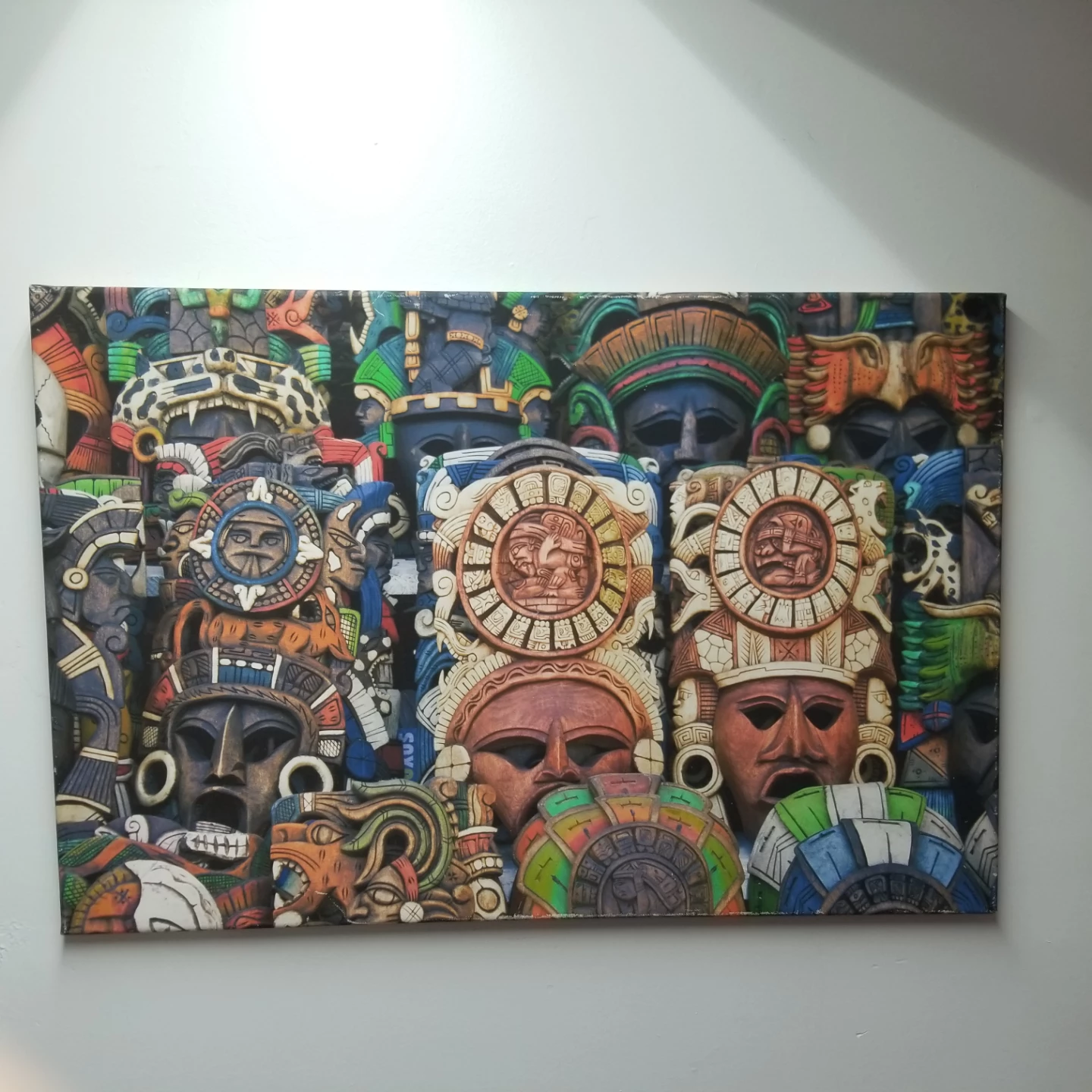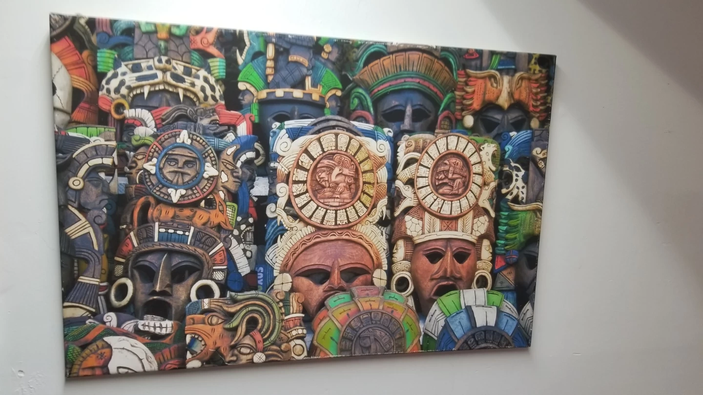 Unique piece of wall art featuring a collection of Aztec masks. The masks have intricate details and a variety of colours. Perfect for adding a cultural touch to your home decor