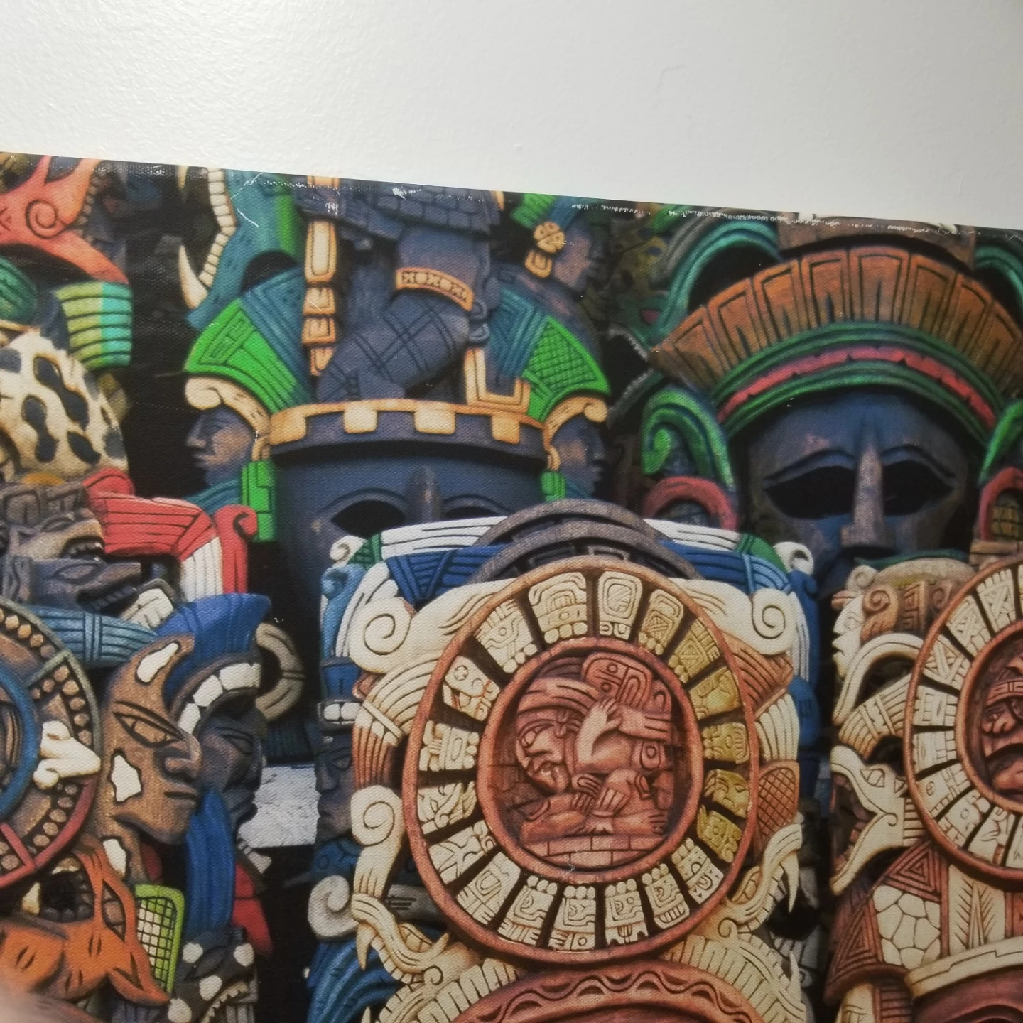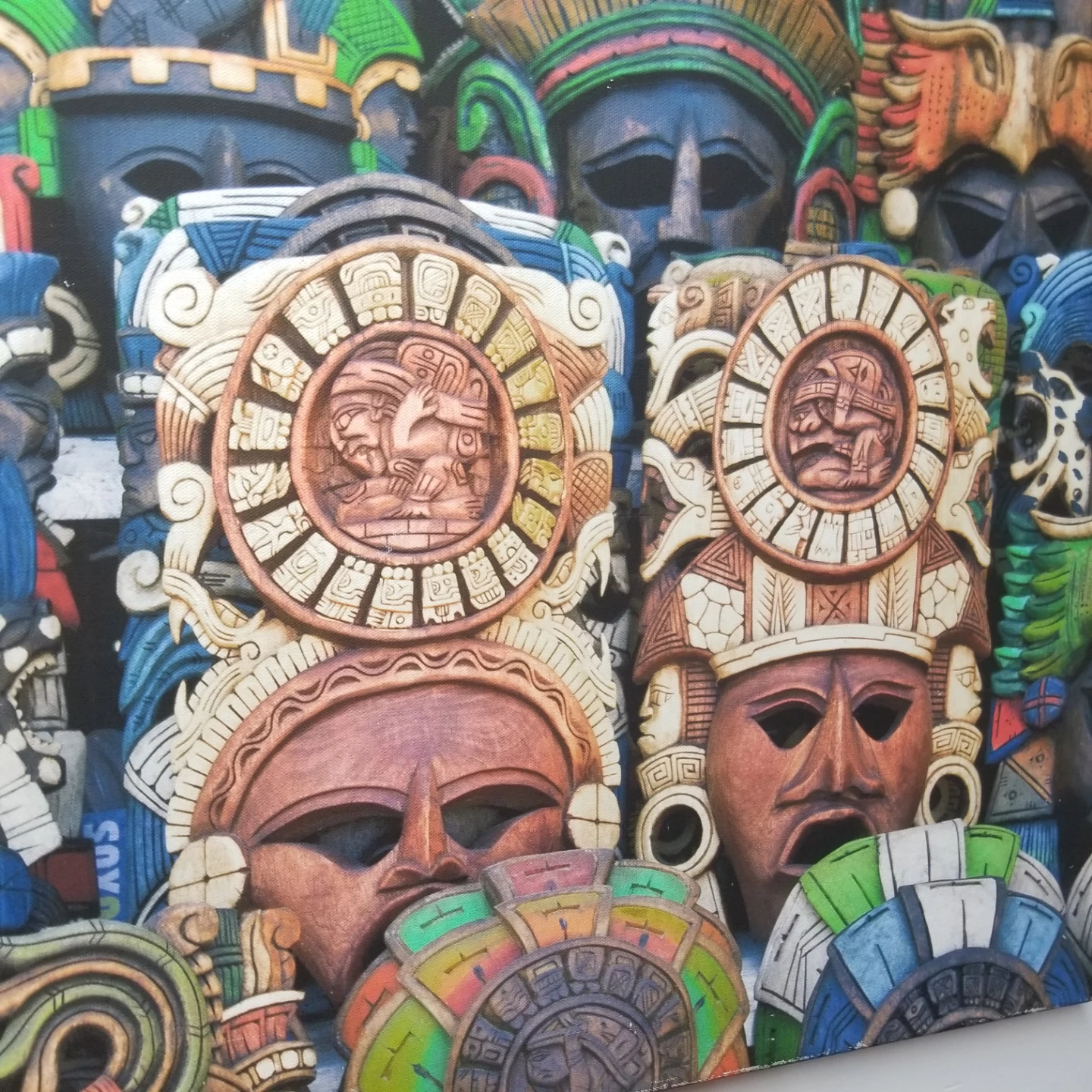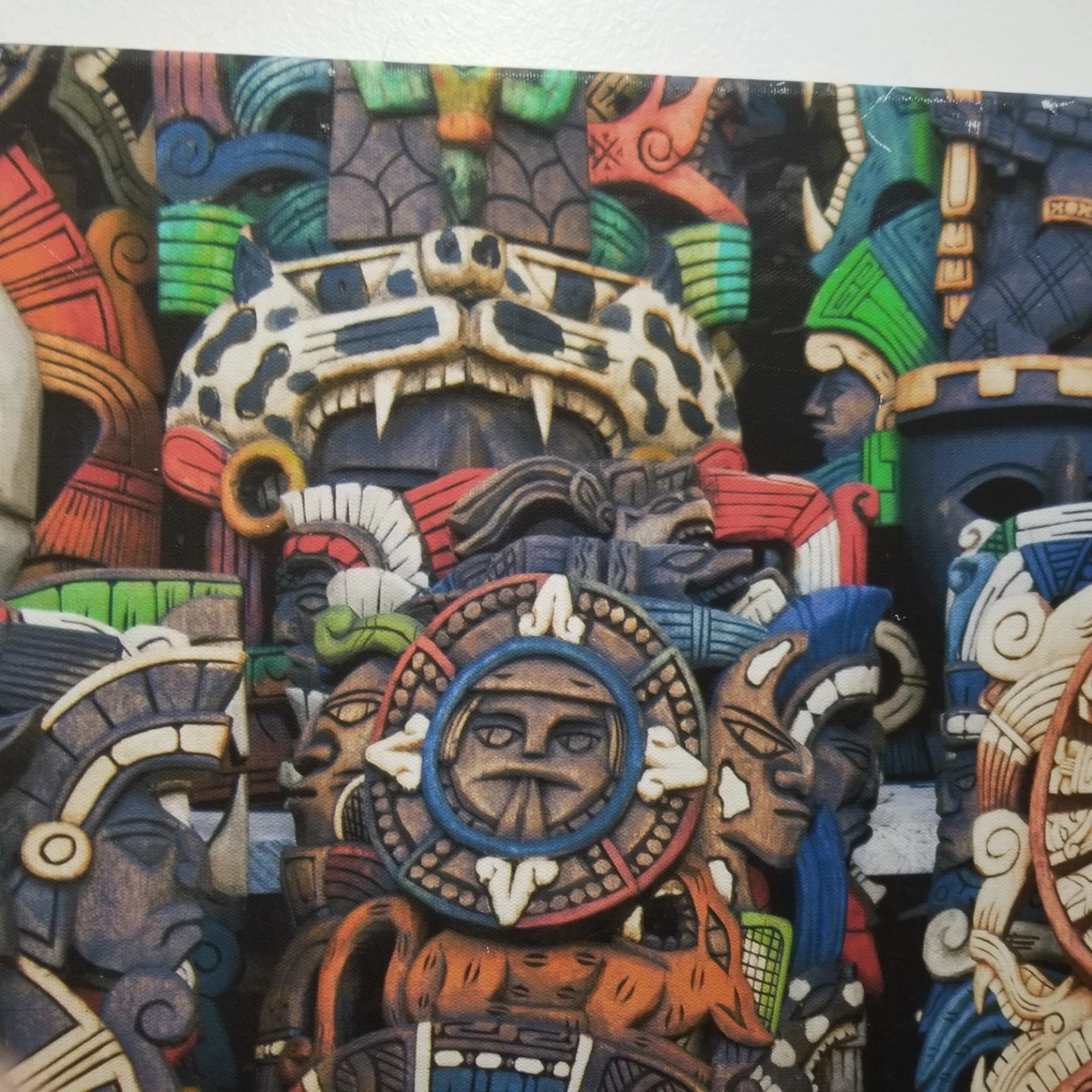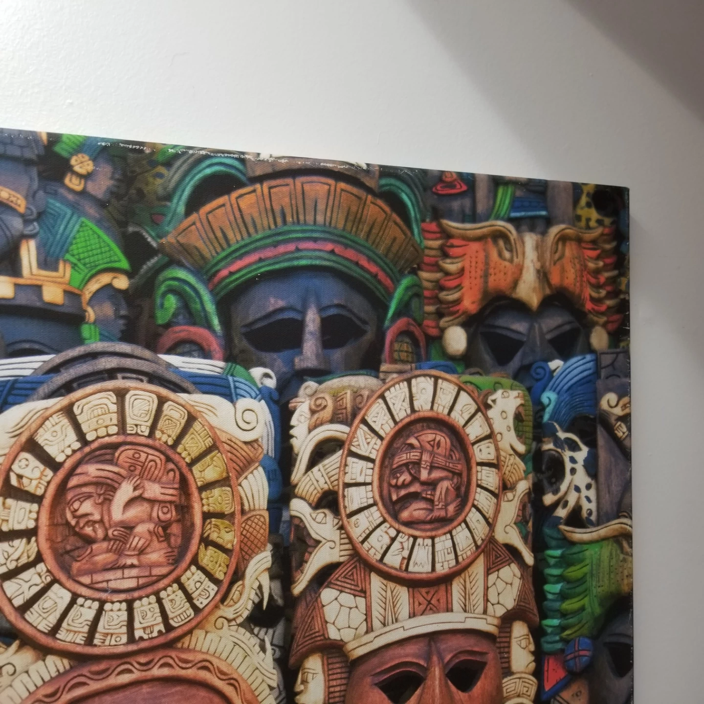 Unique piece of wall art featuring a collection of Aztec masks. The masks have intricate details and a variety of colours. Perfect for adding a cultural touch to your home decor