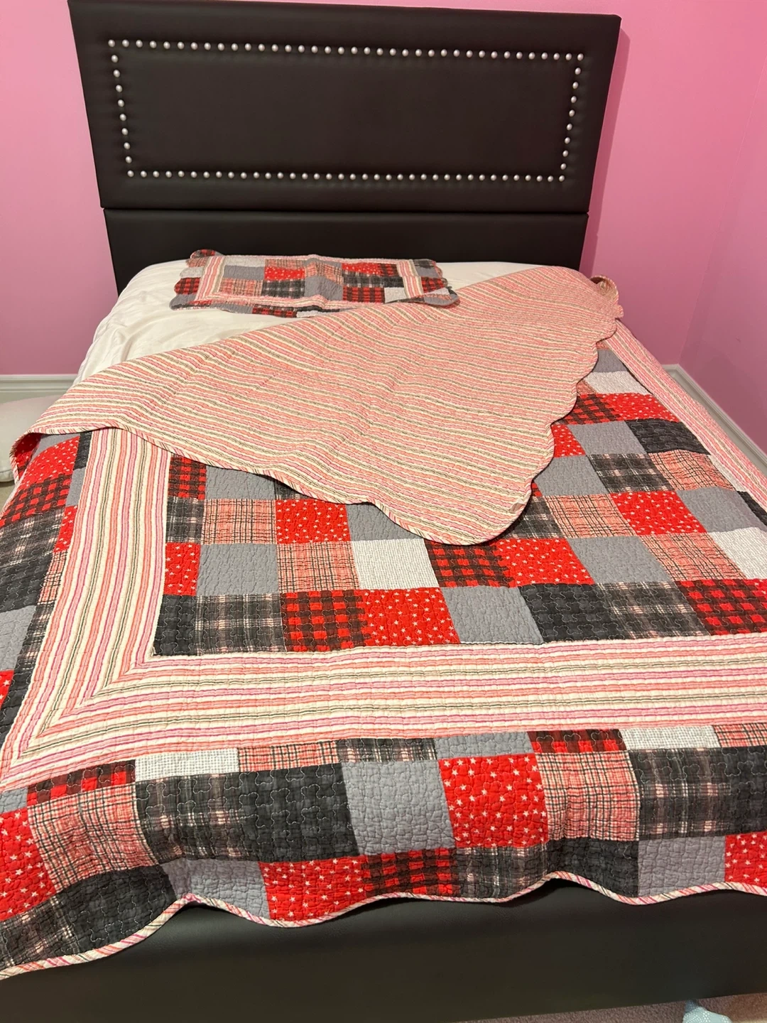 Selling a 2 (patchwork quilt with pillowcase) in red, grey, and black tones. It's perfect for adding a cozy touch to any bedroom or living space. The quilt features a unique patchwork design that would complement a variety of decor styles. It's twin size,new never used .