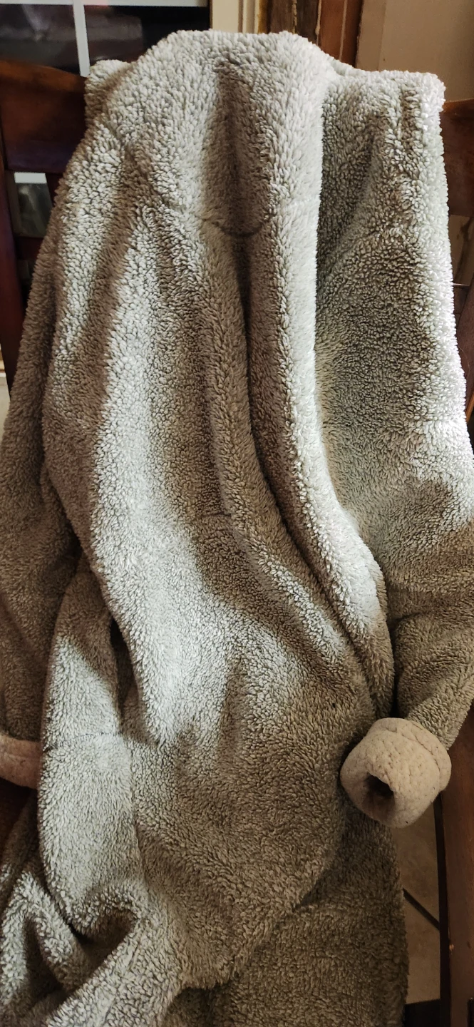Selling a cozy grey hooded blanket! It's super soft and perfect for snuggling up on the couch during those chilly Canadian evenings. It’s in great condition and ready to keep you warm
