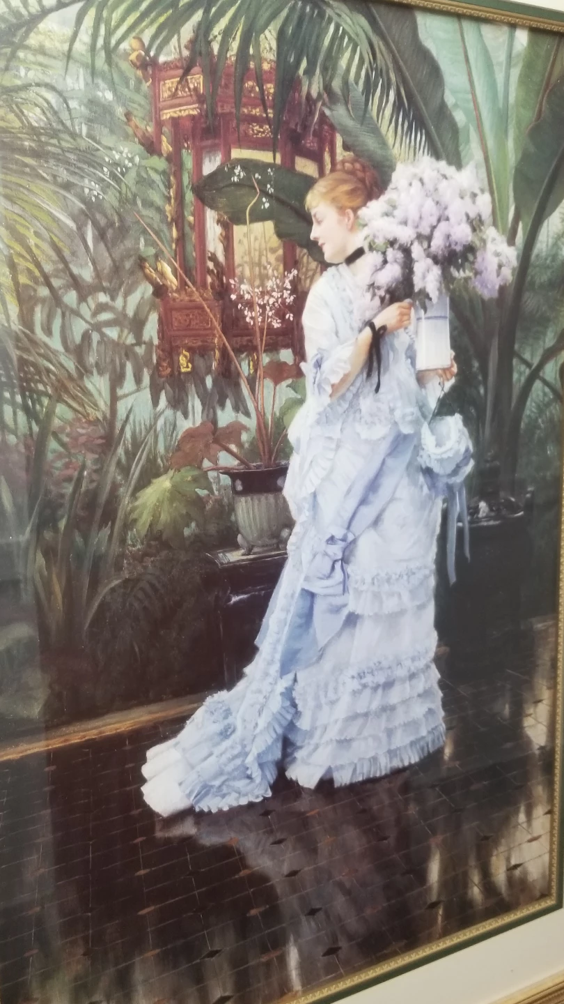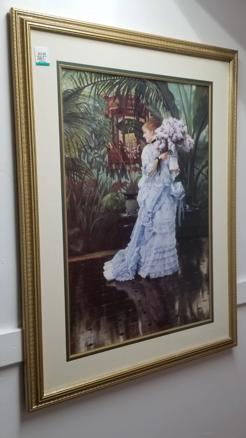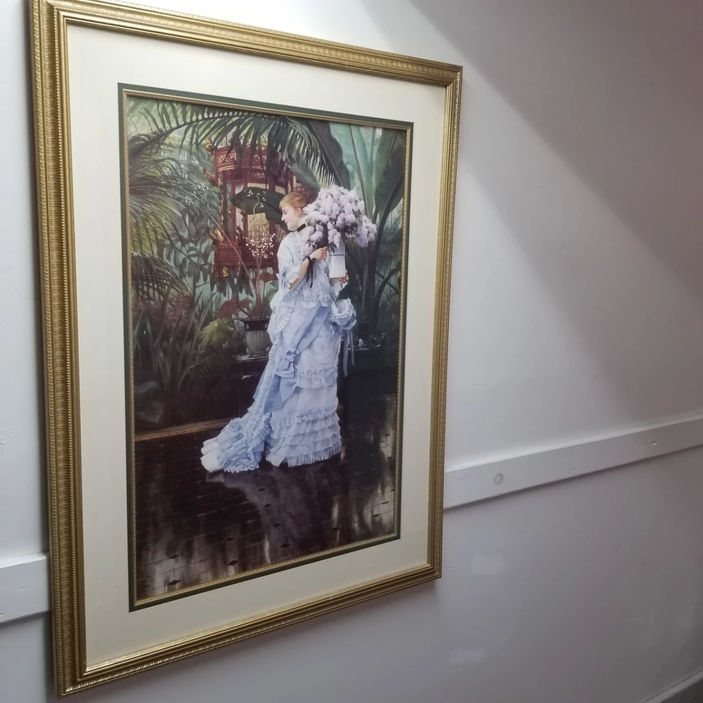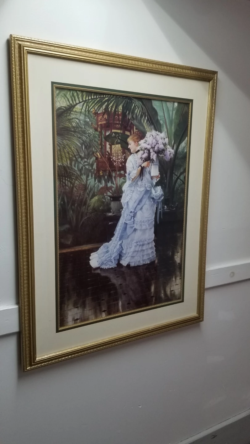 Framed print of a woman in a blue dress in a garden setting. The frame is gold coloured. This print would look great in any room!