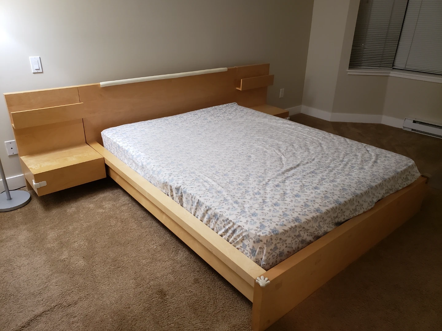 Selling a wooden bed frame that comes with attached nightstands! It's a unique design and a great space saver. The frame is in good condition and ready for a new home. Perfect for adding a touch of modern style to your bedroom