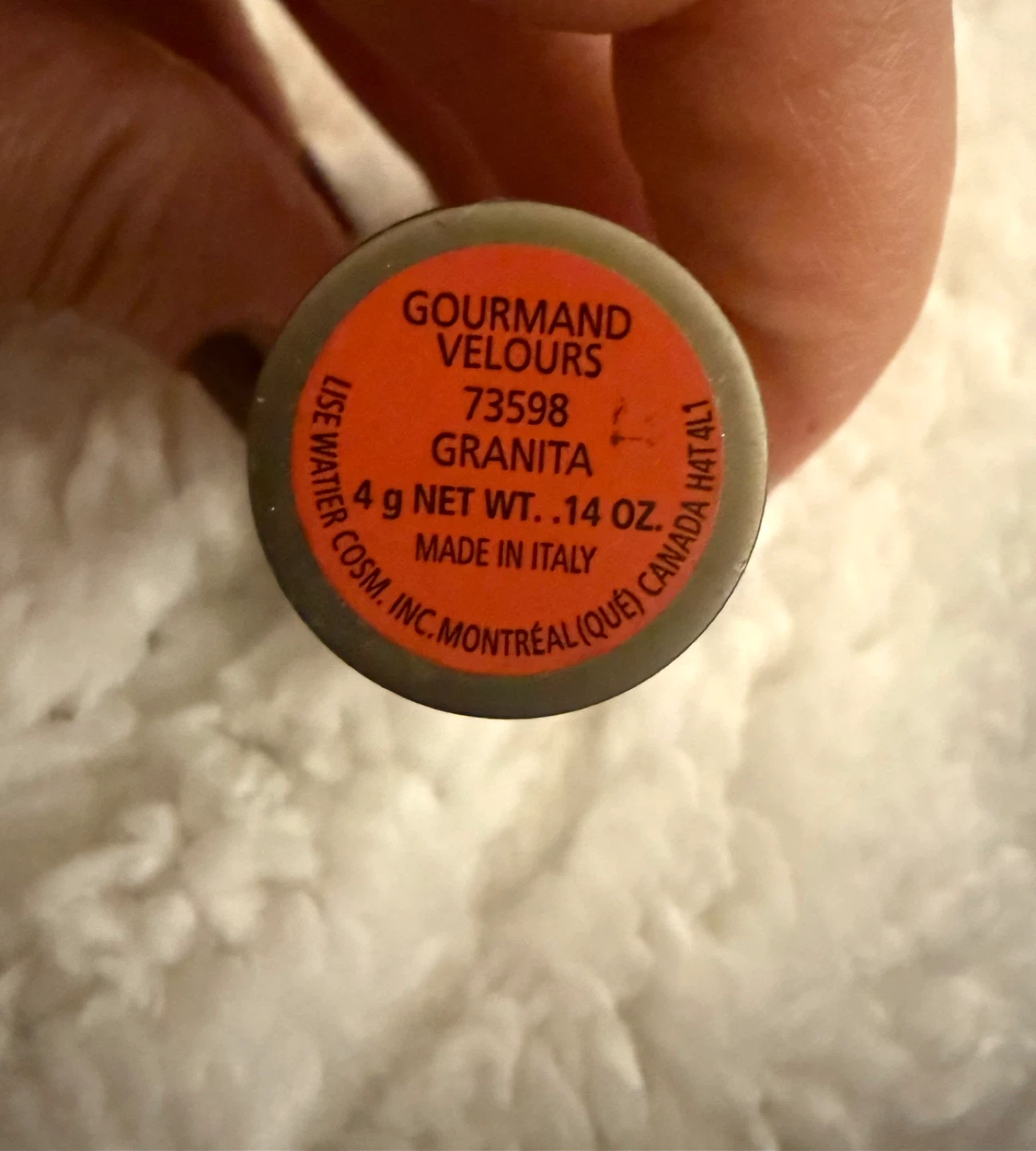 Selling a coral color, Lise Watier Gourmand Velours lipstick in the shade Granita. It's a beautiful, vibrant red / orange colour! Perfect for winter time! The lipstick is 4.4g / .14 oz. Made in Italy