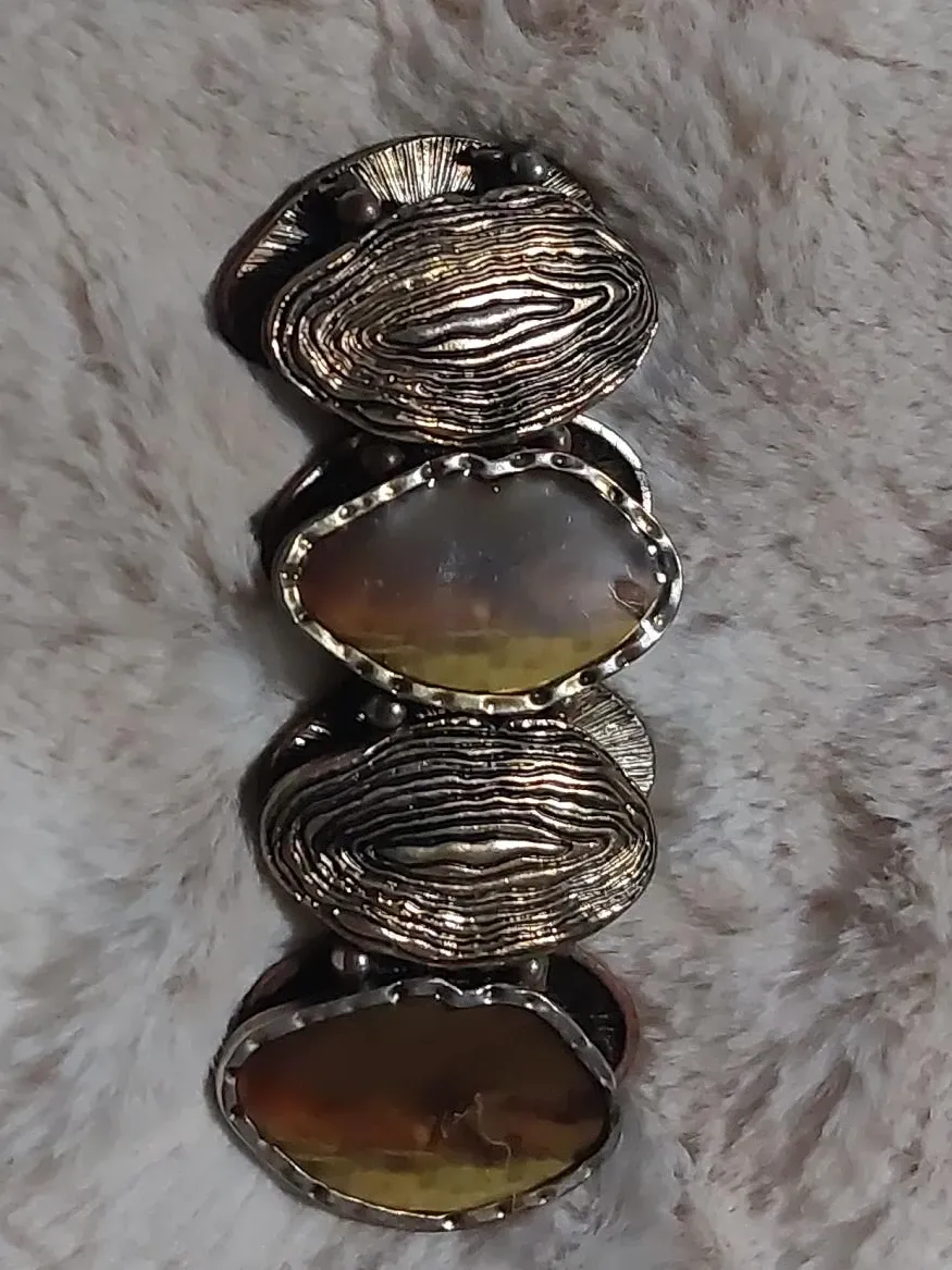 This is a unique, vintage-style stretch bracelet. It features a combination of textured metal and smooth, amber-colored stones. A great piece to add to your jewelry collection!