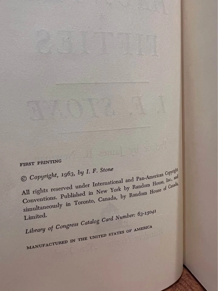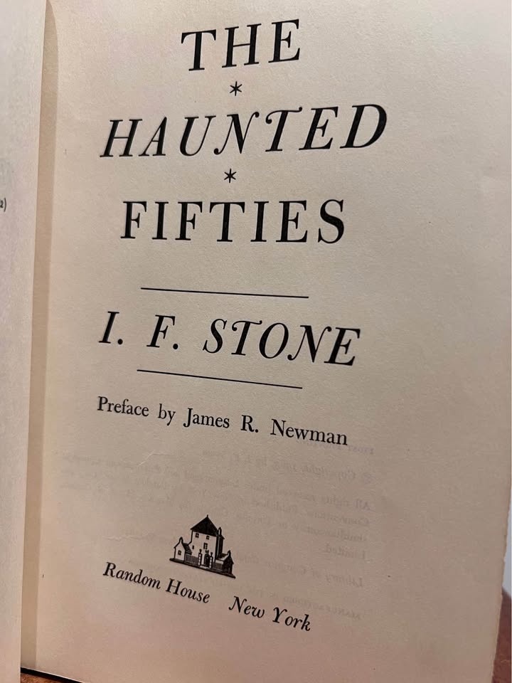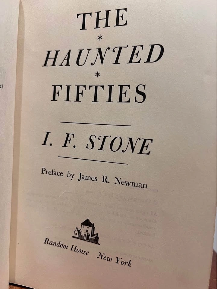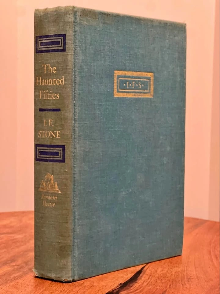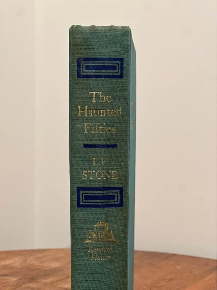 This is a first edition book of The Haunted Fifties by I.F. Stone, published in 1963 by Random House in New York. It's a collection of pieces from the first ten years of Stone's weekly newsletter.