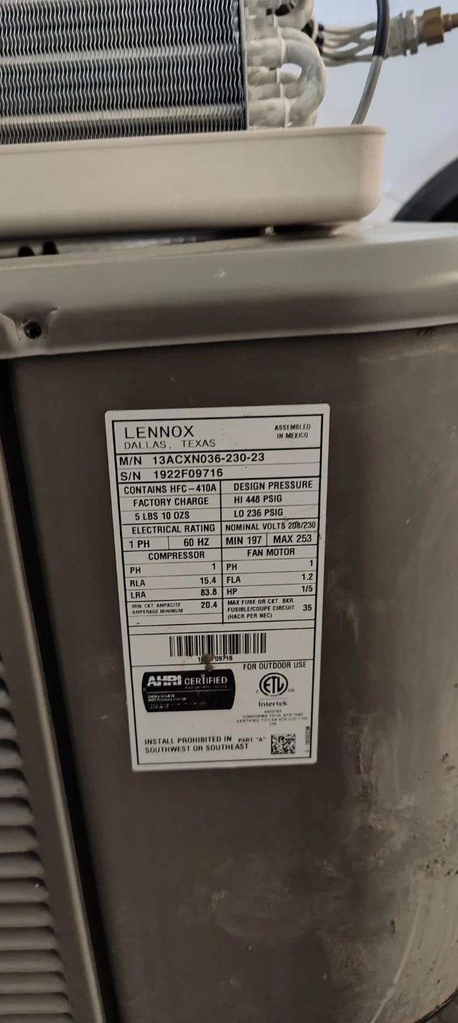 Selling a 3 year old Lennox air conditioner unit. The model number is 13ACXN036-230-23. It was assembled in Mexico. Factory charge contains HFC-410A. For outdoor use.