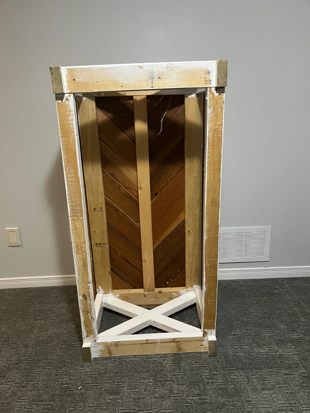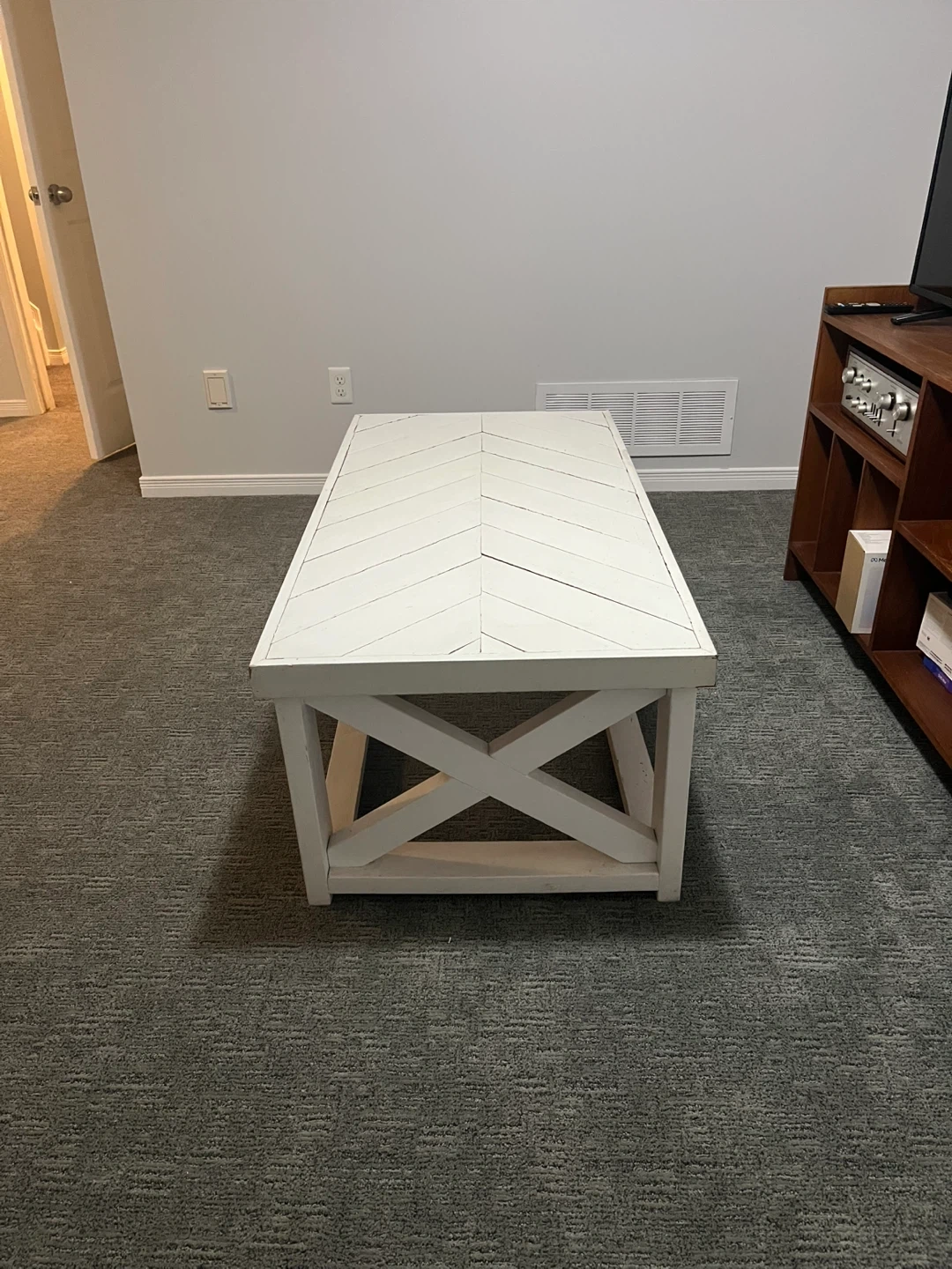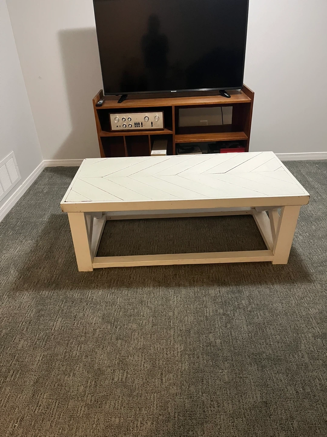 Selling a cute white wooden coffee table! It's in great condition and has a unique herringbone pattern on top. Perfect for adding a touch of rustic charm to your living room