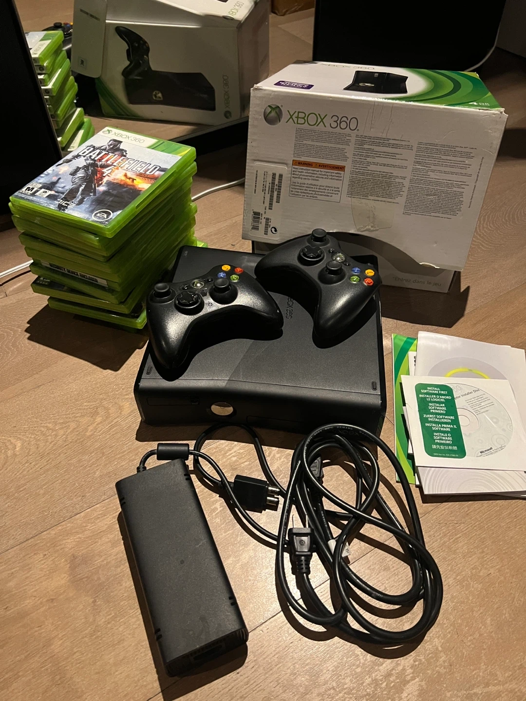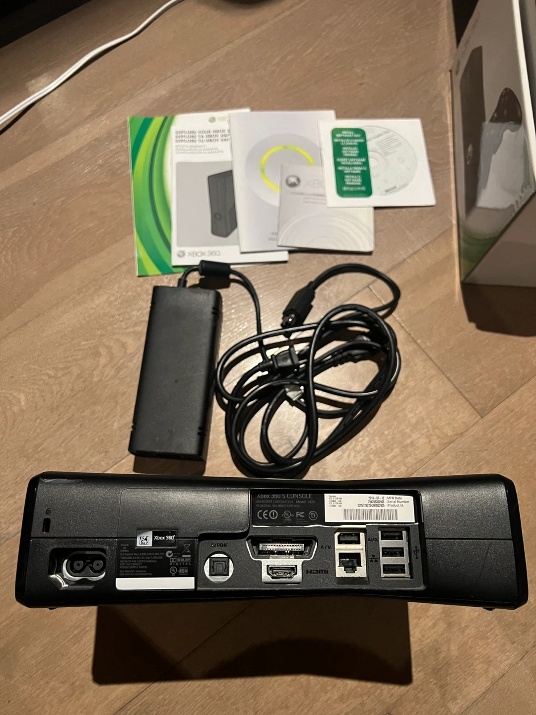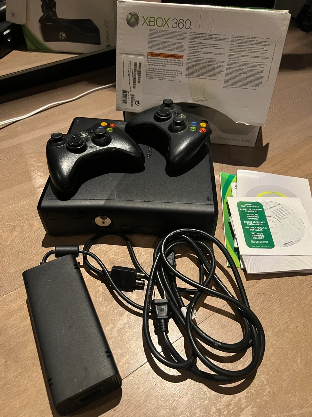 Selling a 4GB black Xbox 360 console. Includes two controllers, the power adapter, all cables in original box with manuals!