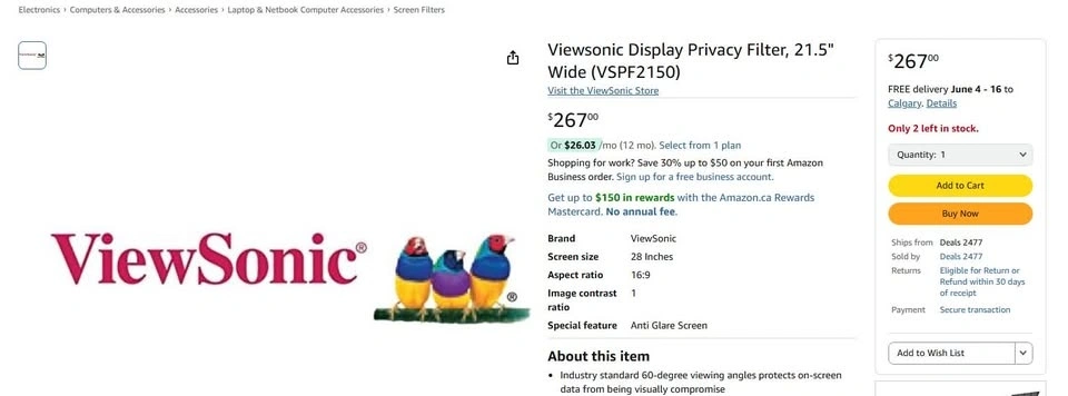 Viewsonic Display Privacy Filter, 21.5" Wide (VSPF2150)