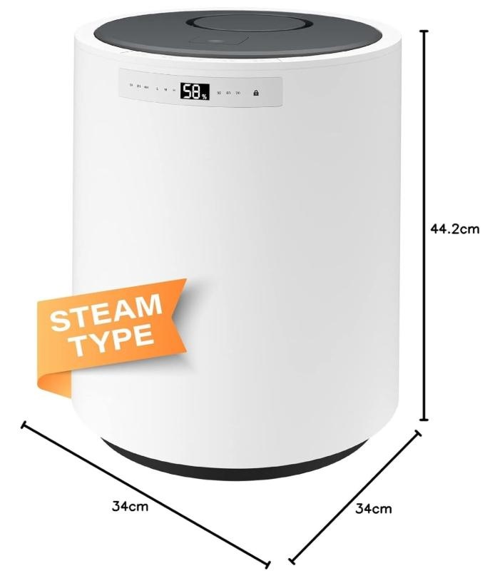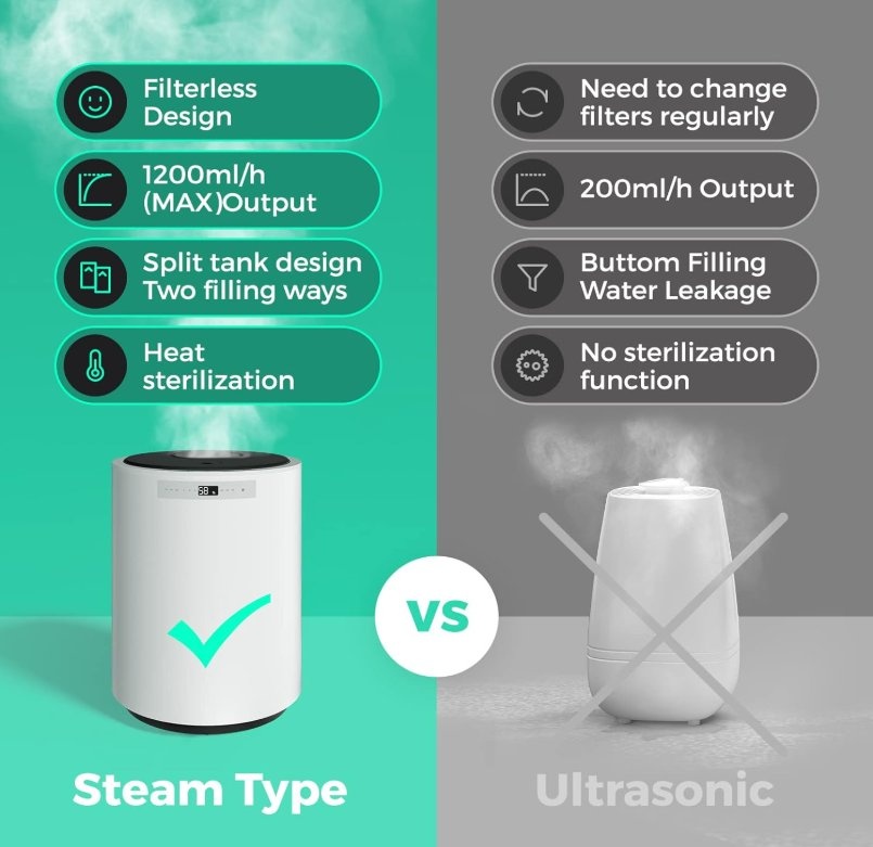 99.9% Germ-free - Steam humidifier offers more healthy and clean mist by heating evaporation technology - after high-temperature sterilization at 100 ℃, it is cooled to 50 ℃ through high and low pressure air ducts to output sterile distillation warm mist, making it suitable for use by people with rhinitis and respiratory tract sensitivity.