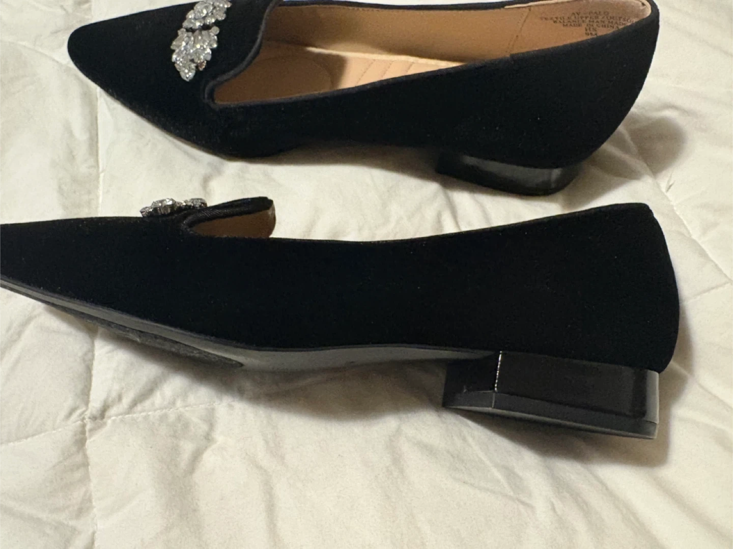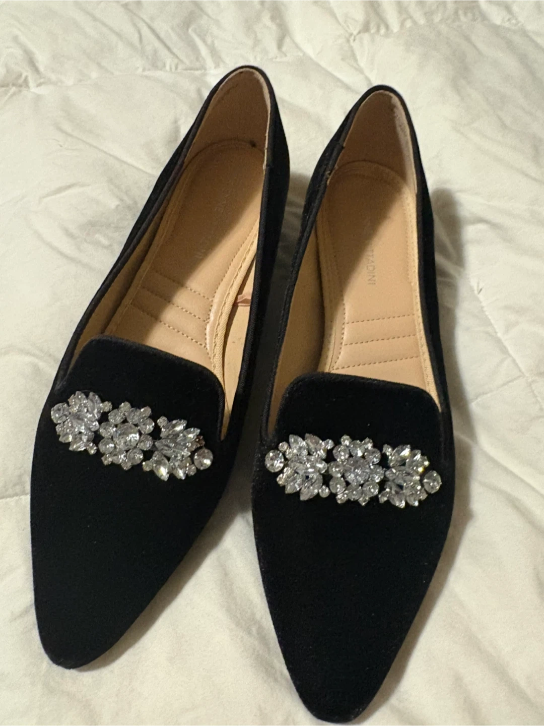 Selling a pair of Adrienne Vittadini black velvet loafers. They feature a decorative jeweled embellishment on the front. They are a size 9m brand new never used