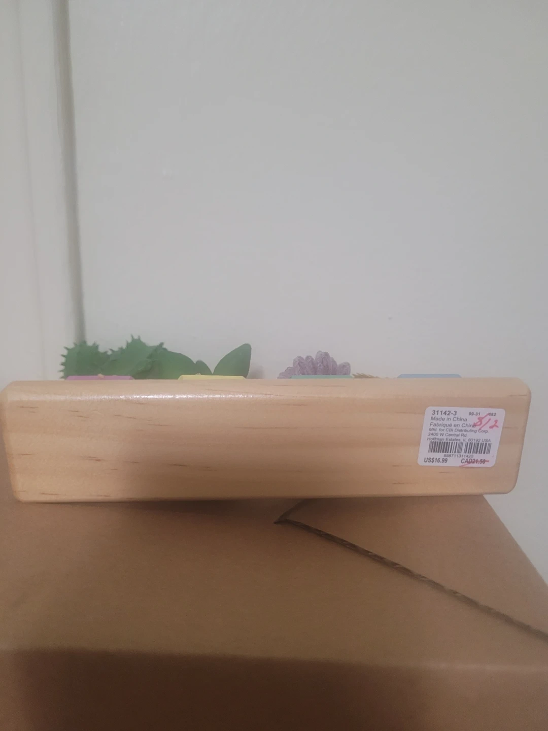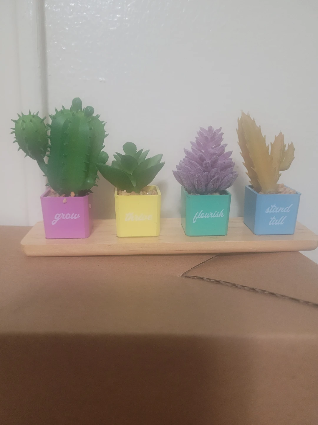 Cute miniature plant decor with a light wood base and colourful pots. Each pot has a different word: grow, thrive, flourish, and stand tall. From claires