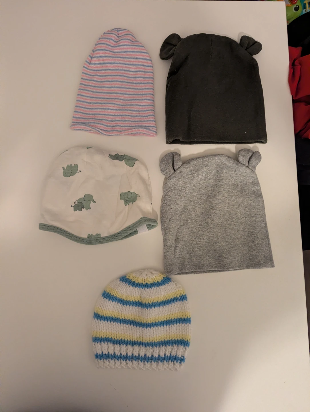 Selling a bundle of baby hats in various styles and colours! These hats are perfect for keeping your little one warm and cozy. The bundle includes knitted hats with pom-poms and hats with adorable bear ears. All in great condition!