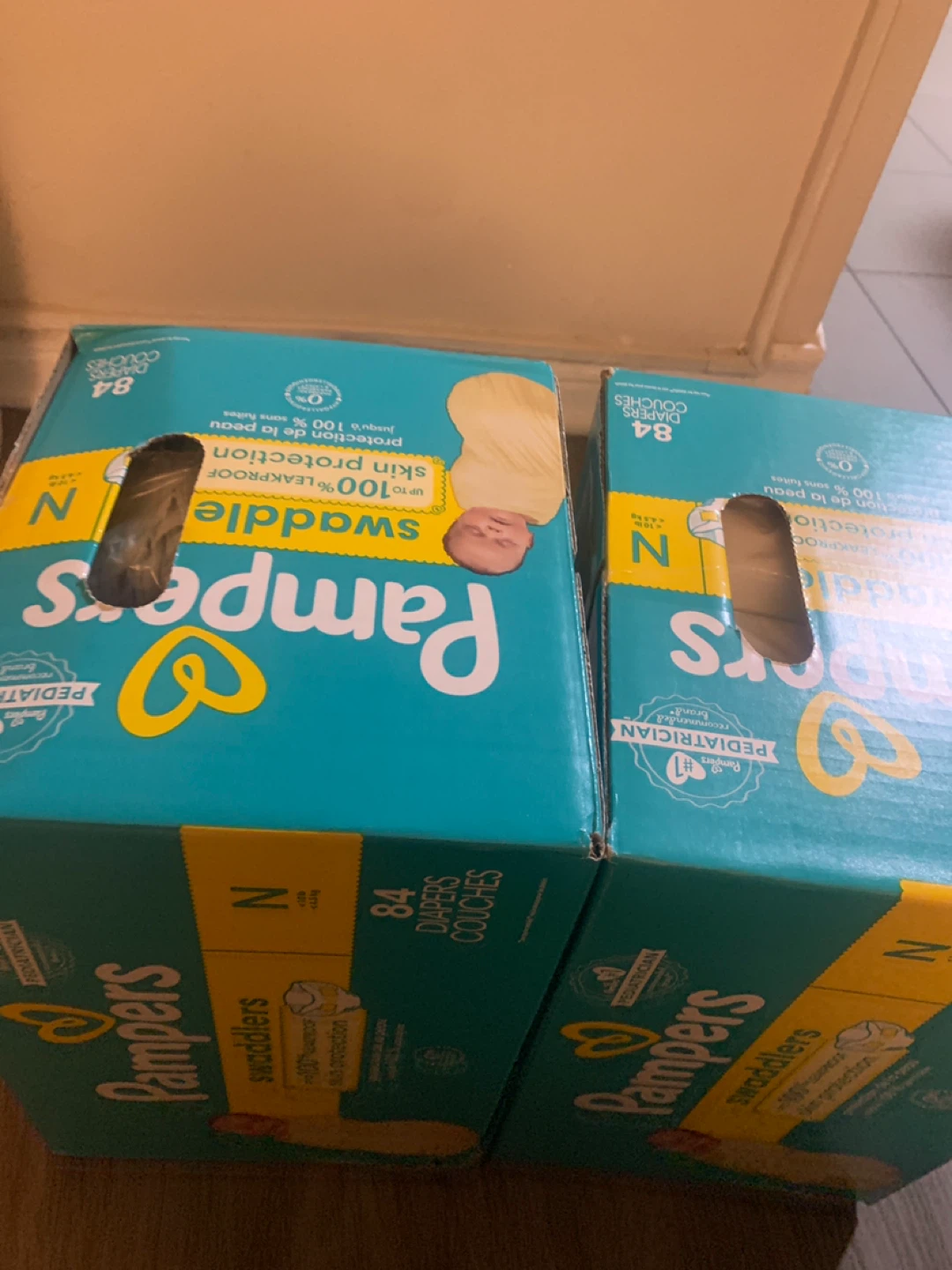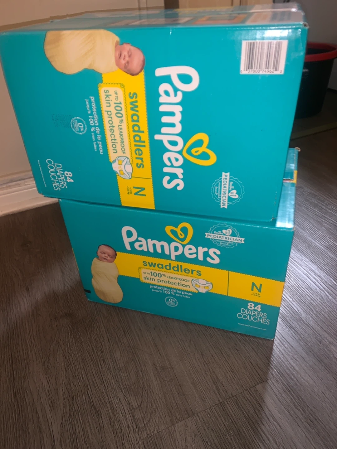 Selling 2 boxes of Pampers Swaddlers diapers TOGETHER for 44$, size N, each containing 84 diapers! They provide up to 100% leakproof skin protection. Perfect for your little one!