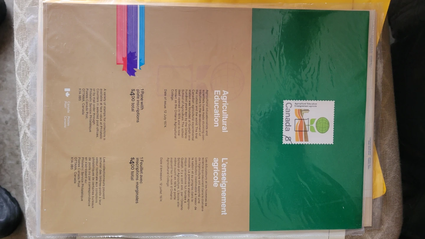 Selling a pane of Canada Post stamps commemorating Agricultural Education, issued on July 12, 1974. This pane includes plate inscriptions and is a neat collectible for stamp enthusiasts or anyone interested in Canadian postal history! Face value is $4