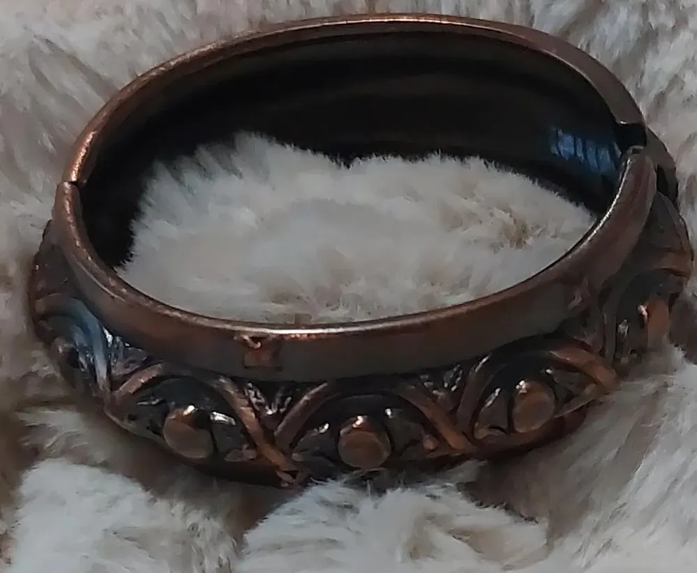 Here's a lovely vintage bangle bracelet! It features a unique copper-toned finish and an ornate design. It’s in great condition and ready to add a touch of vintage charm to your accessories