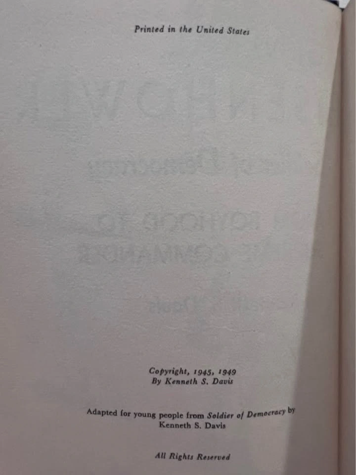 This is a first edition copy of the book General Eisenhower: Soldier of Democracy, a biography of Dwight D. Eisenhower written by Kenneth S. Davis. The hardcover book was published in 1945 by Doubleday, Doran & Company.
