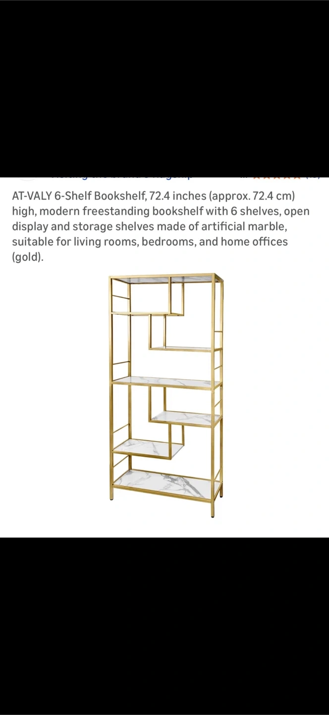 Looking to add some style and storage to your space? This AT-VALY 6-Shelf Bookshelf is a modern freestanding bookshelf that's perfect for living rooms, bedrooms, and home offices. It features 6 shelves, with an open display and storage shelves made of artificial marble and gold-tone metal. It stands 72.4 inches tall.