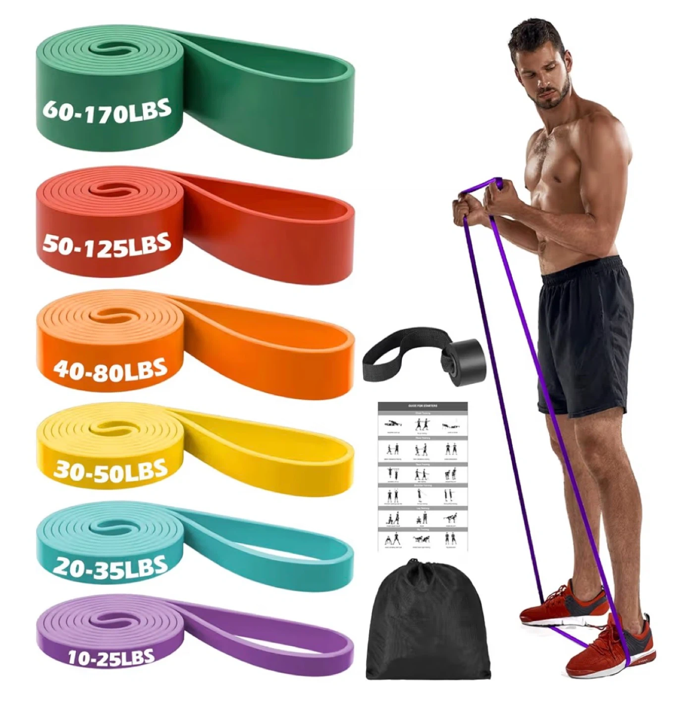 Get ready to level up your workouts with this complete set of resistance bands! This set includes multiple bands with varying resistance levels, ranging from 10-25lbs to 60-170lbs, so you can customize your workout to your fitness level. Also included is a guide for starters and a bag for easy storage and portability