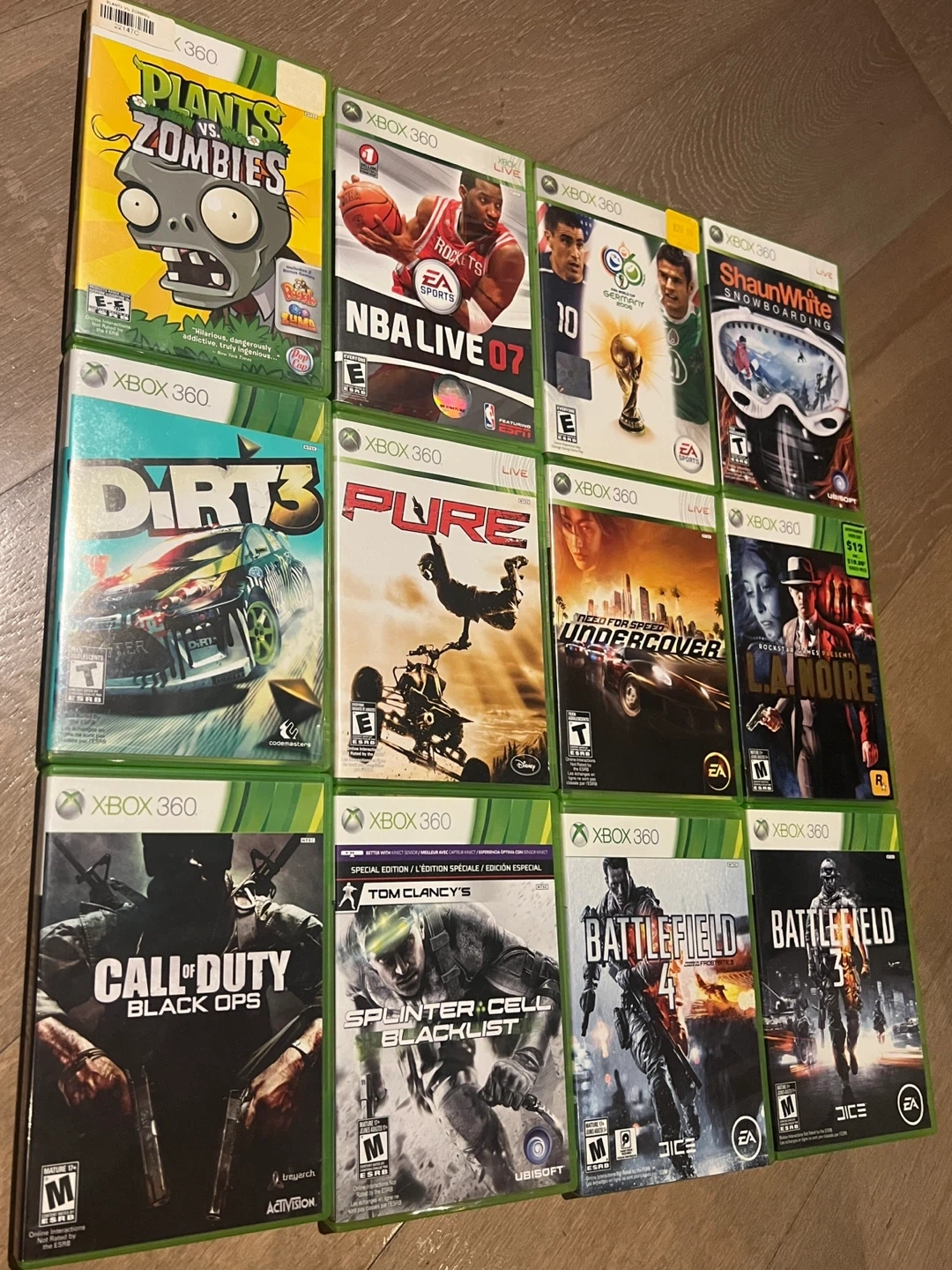 Selling a collection of Xbox 360 games! Titles include Battlefield 3 and 4, Splinter Cell Blacklist, Call of Duty Black Ops, L.A. Noire, Need for Speed Undercover, Pure, Dirt 3, Shaun White Snowboarding, 2006 FIFA World Cup, NBA Live 07, and Plants vs Zombies