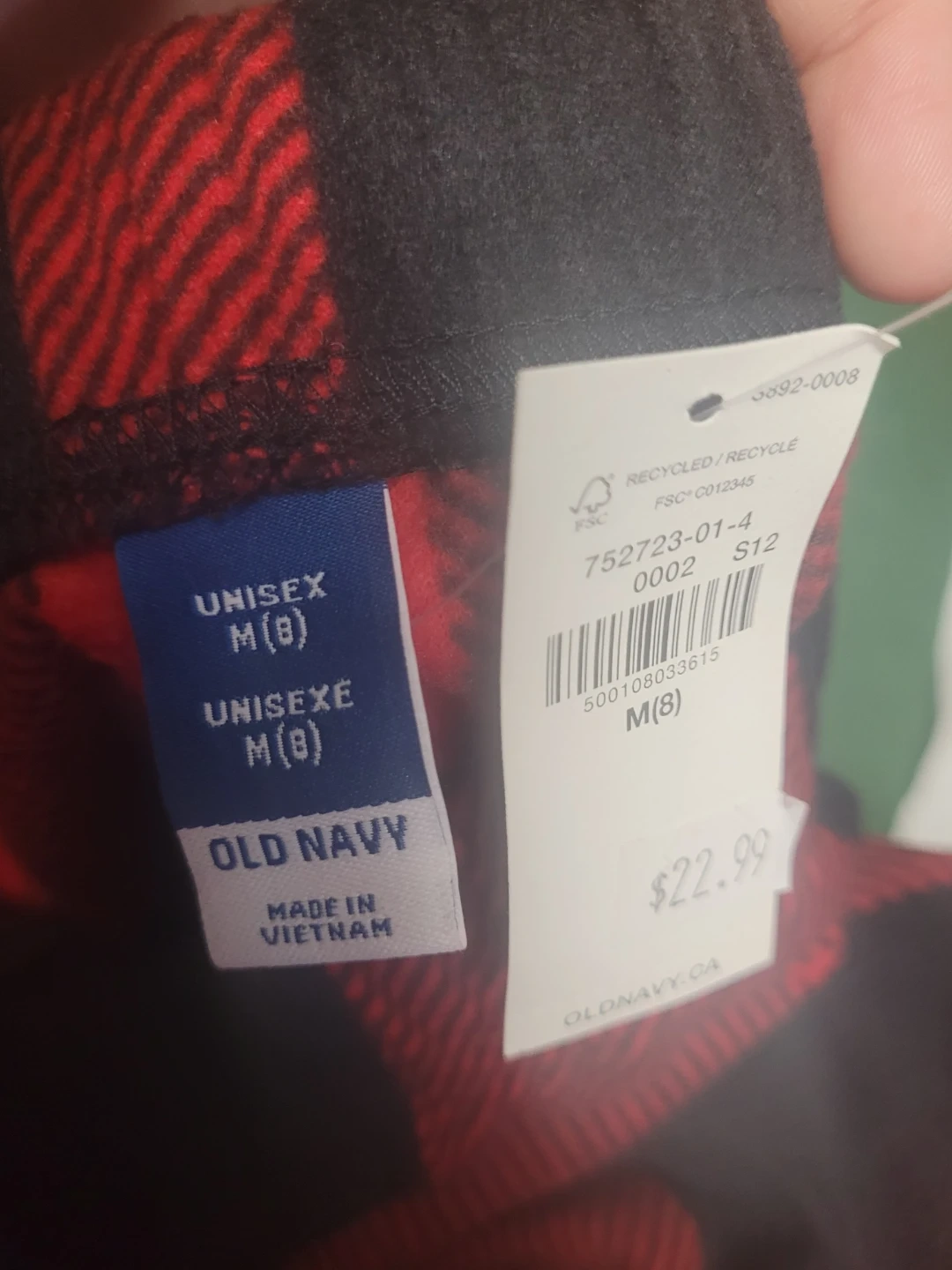 Selling a pair of Old Navy unisex plaid pants in size M(8). They feature a classic red and black buffalo plaid pattern. Originally $22.99. Perfect for cozy days!