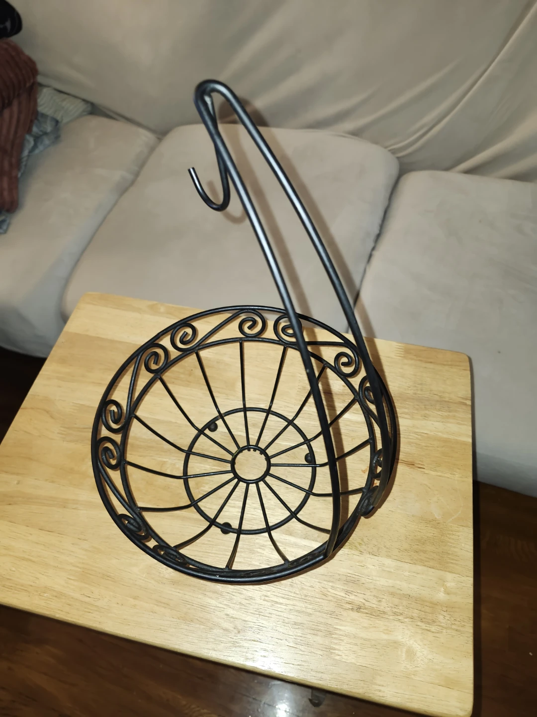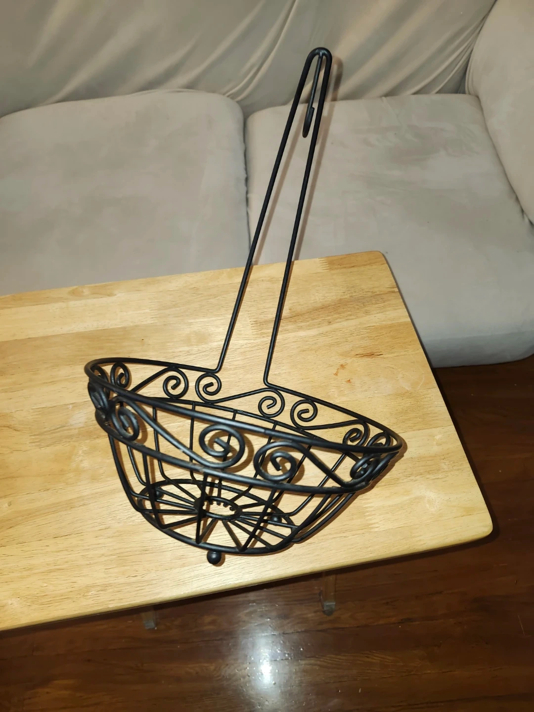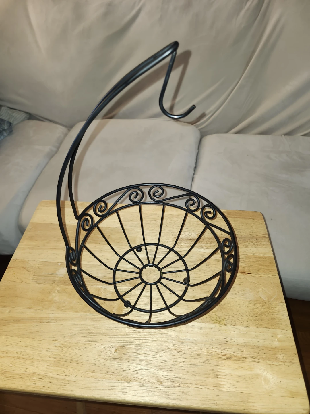 Selling a black metal fruit basket with a hook! It's in great condition and would be perfect for storing fruit in the kitchen or pantry. The design is simple and elegant, and the hook allows you to hang it easily