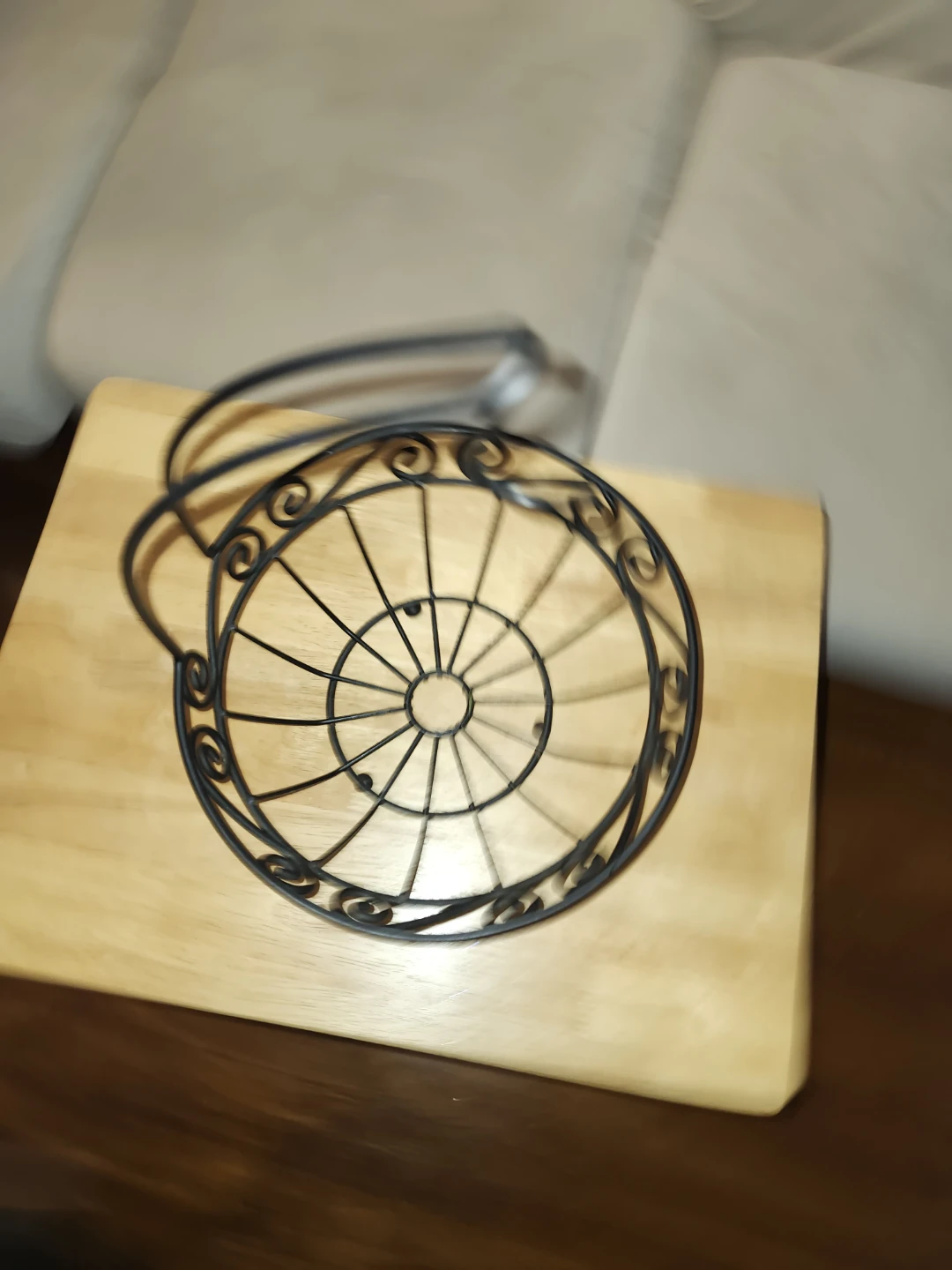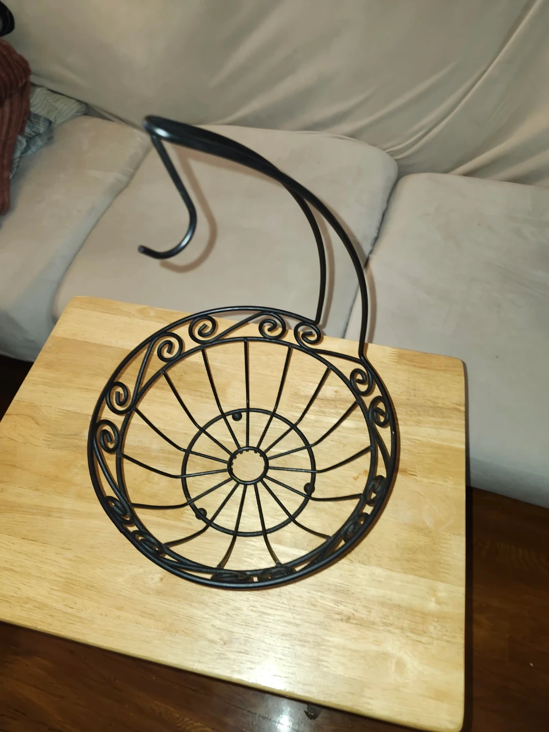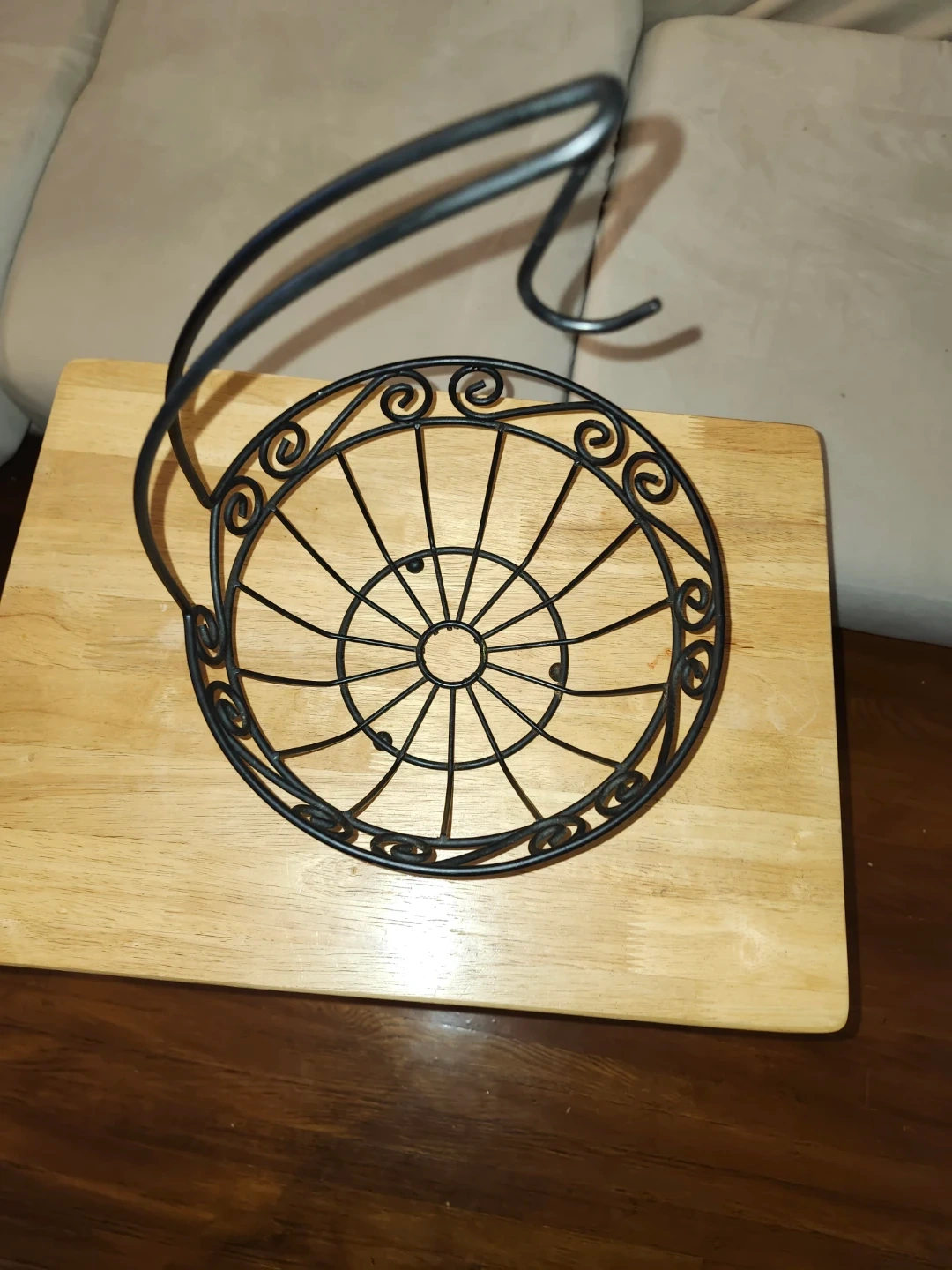 Selling a black metal fruit basket with a hook! It's in great condition and would be perfect for storing fruit in the kitchen or pantry. The design is simple and elegant, and the hook allows you to hang it easily