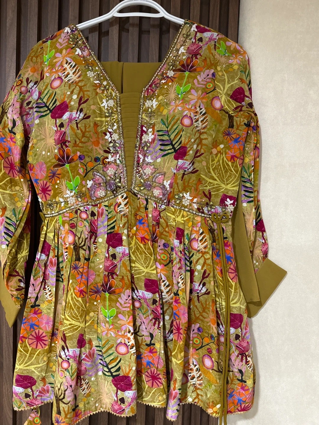 Beautiful floral print dress featuring delicate embellishments. The dress has a unique design and is perfect for special occasions or adding a touch of elegance to your wardrobe. It's in great condition and ready for a new home! Comes with pant and dupatta!