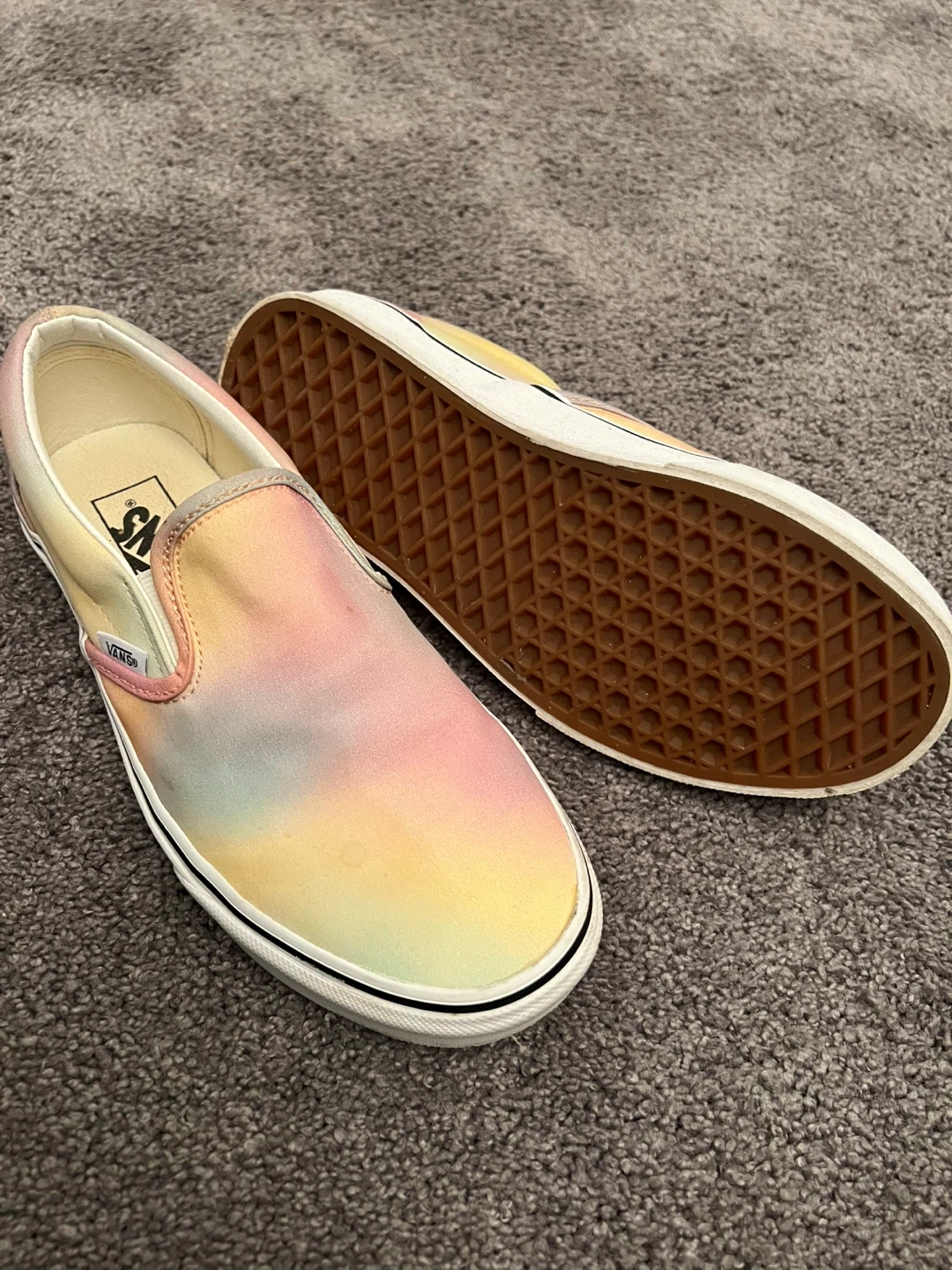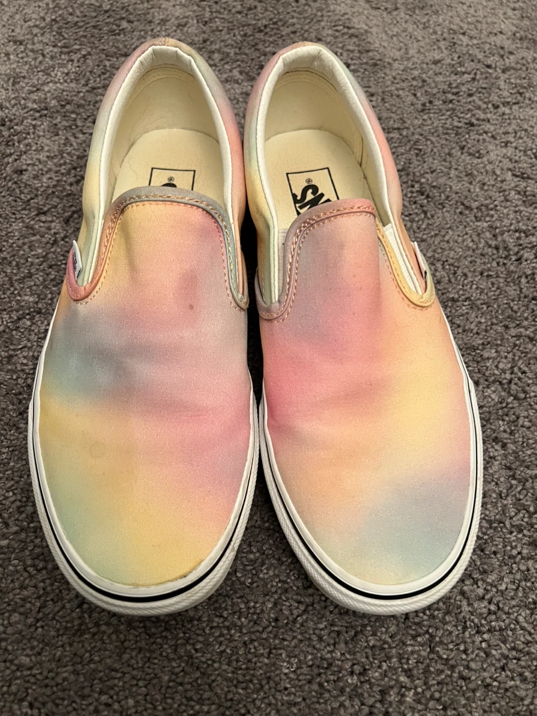 These are a pair of Vans Classic Slip-On sneakers in a pastel tie-dye pattern. They're a women's size 8.5 and have a classic, comfortable fit. They're in great condition with a couple of faint marks.