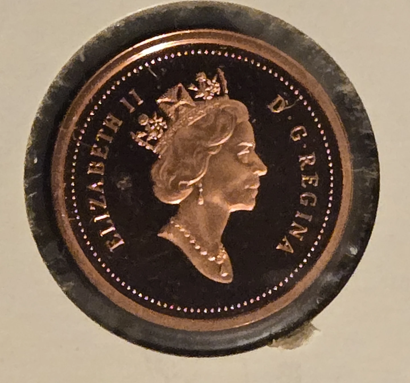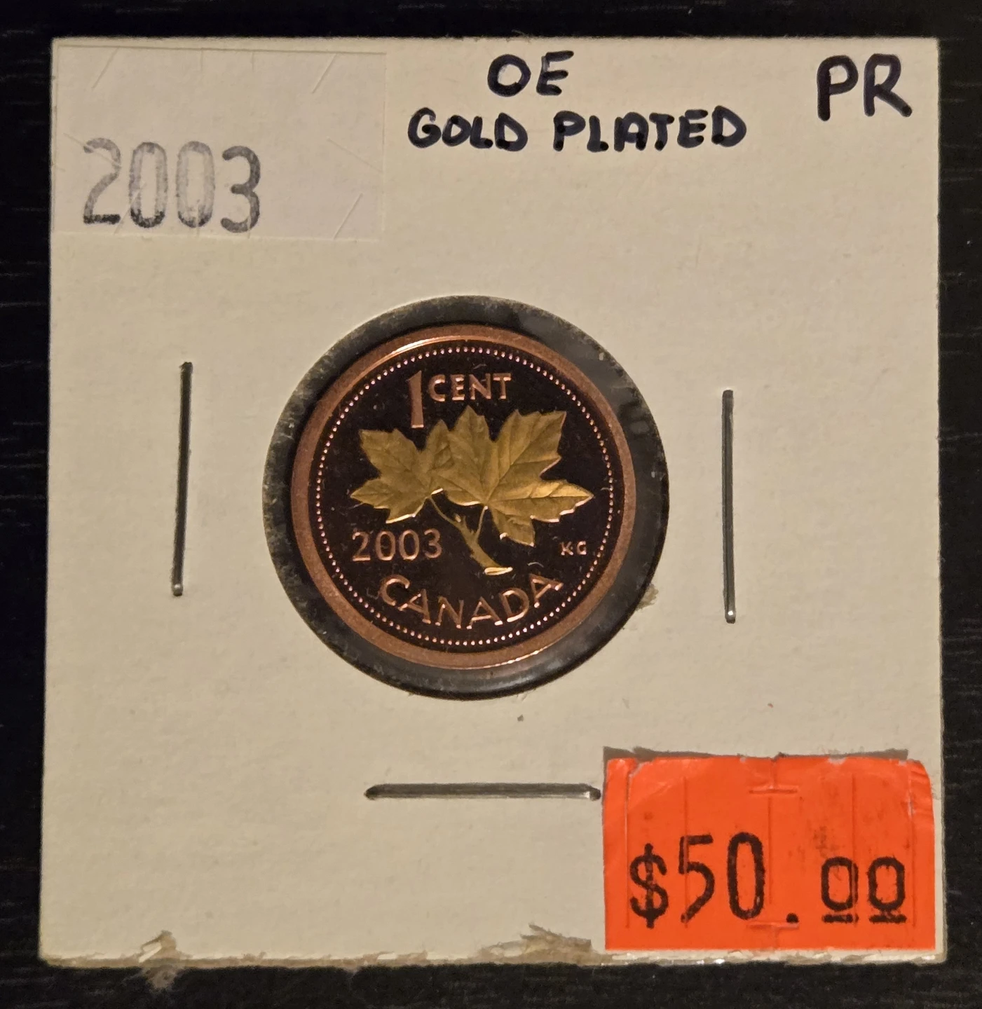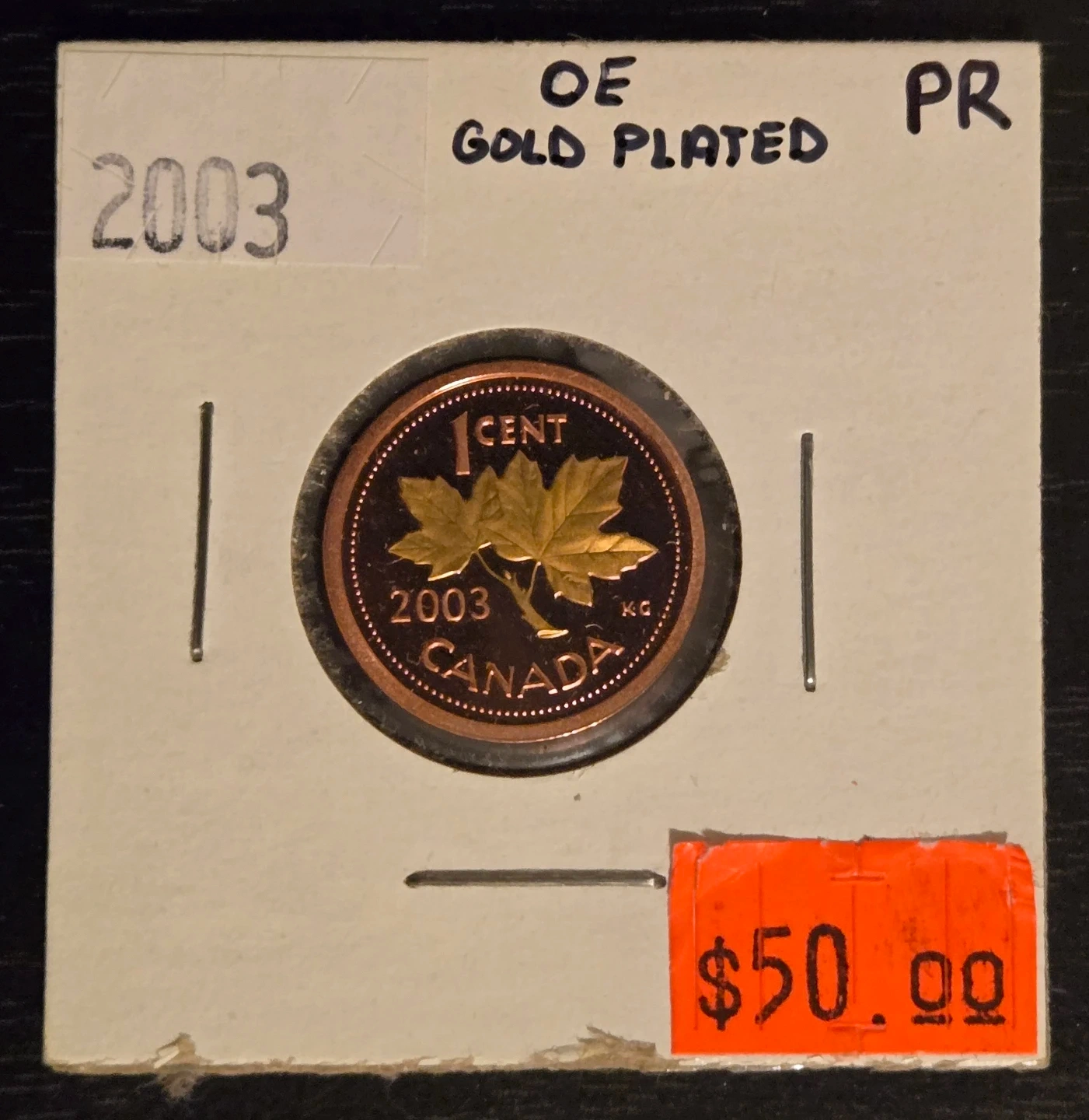 Selling a 2003 gold plated Proof Canadian one cent coin. The coin features Queen Elizabeth II on one side and the maple leaf on the other. Originally priced at $50 in 2003. ASKING $30 FIRM.