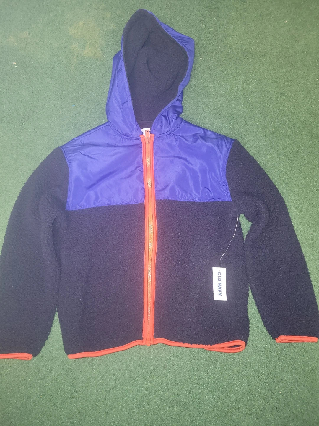 A cozy and stylish fleece zip-up hoodie from Old Navy for kids! The hoodie features a colour-blocked design with a blue upper section and a navy blue fleece body. The zipper is a bright orange, adding a pop of colour. Perfect for keeping your little one warm and looking great!