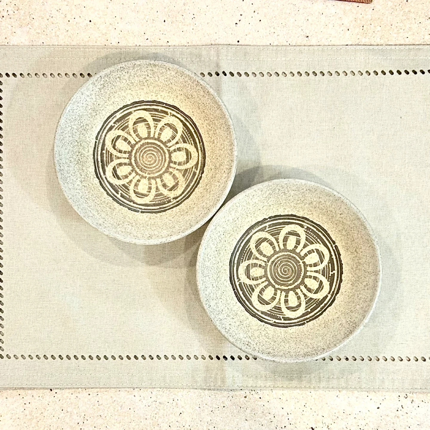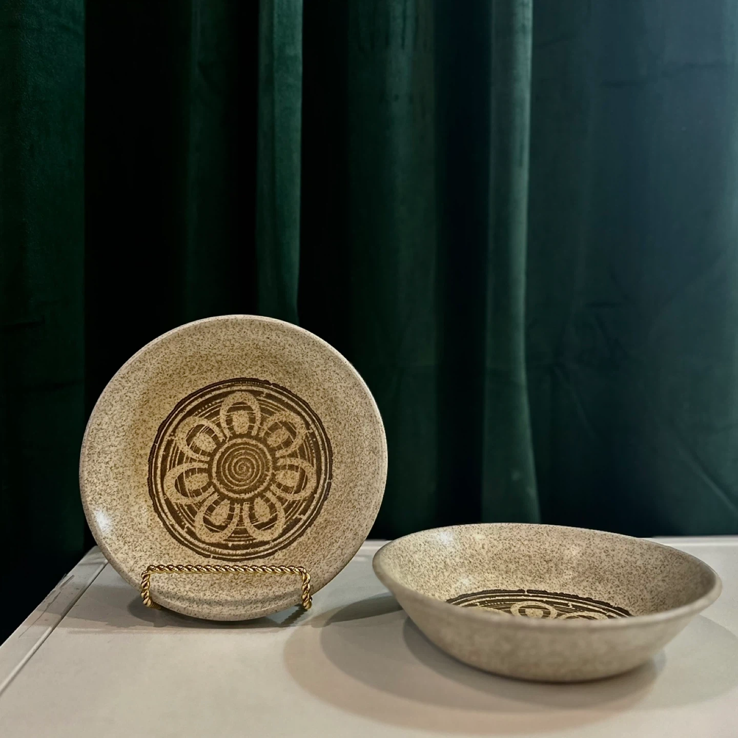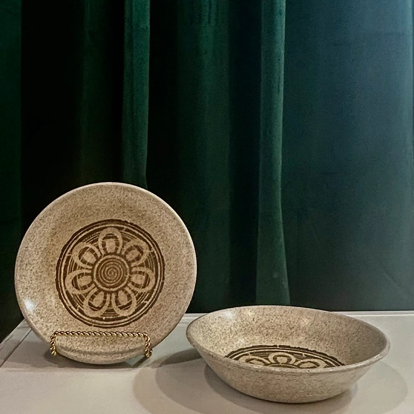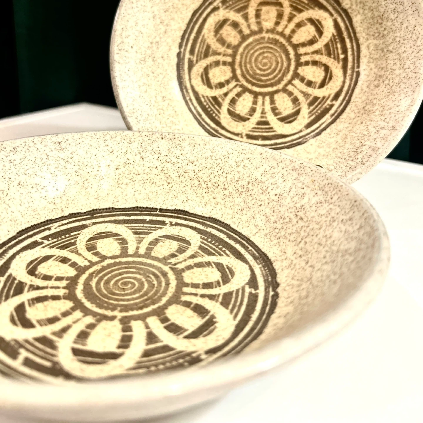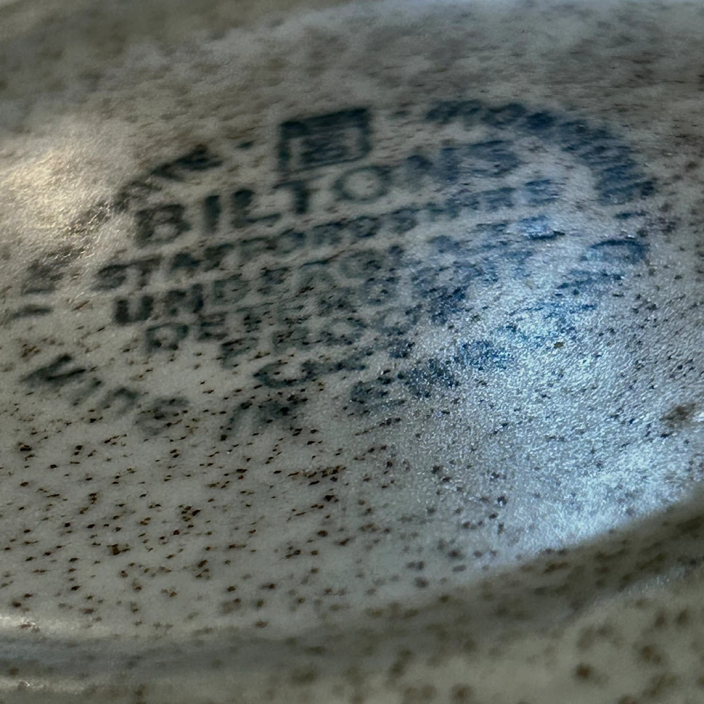 Biltons is best known among collectors for its restrained, architectural designs and exceptionally durable ironstone bodies. The Monastone line is particularly sought after for its organic speckled glaze, earthy palette, and bold circular floral motif—a design language that bridges traditional British ceramics and early modernist studio ware.