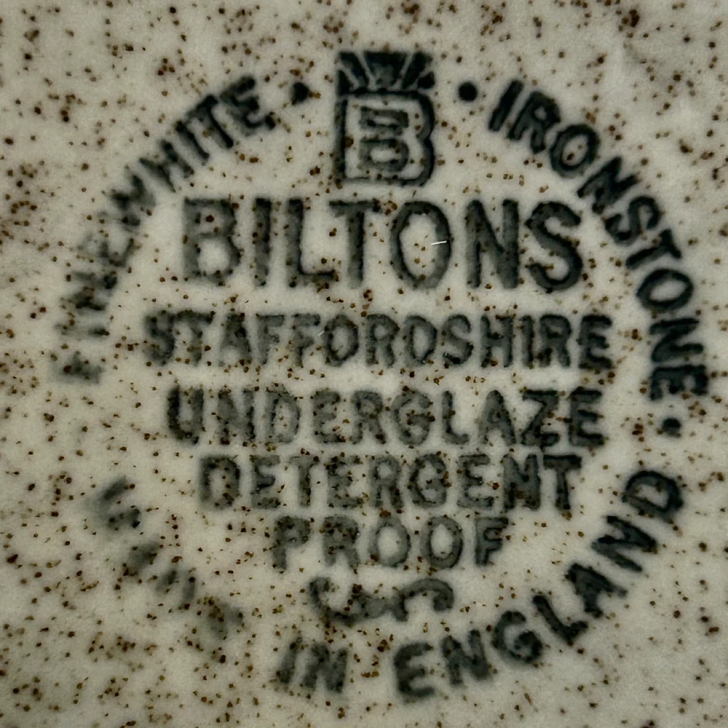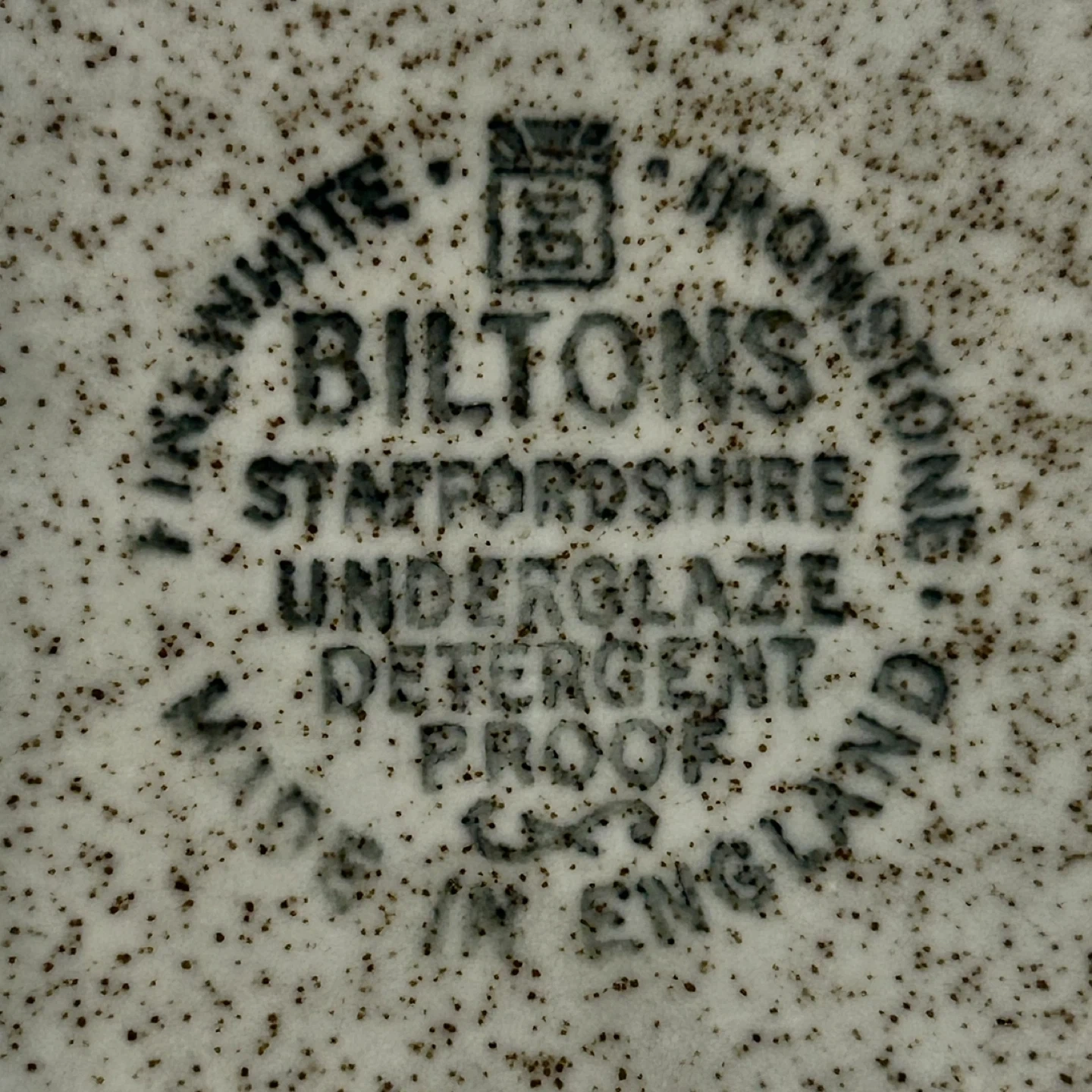 “BILTONS – STAFFORDSHIRE – UNDERGLAZE – DETERGENT PROOF – MADE IN ENGLAND – MONASTONE”, confirming authenticity and period manufacture.