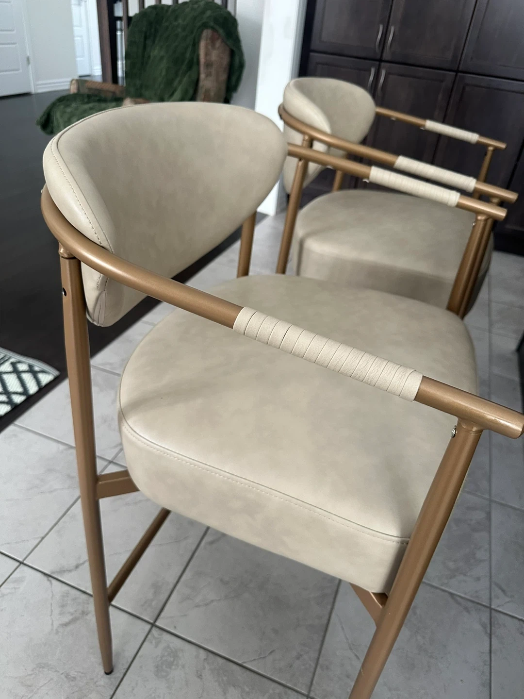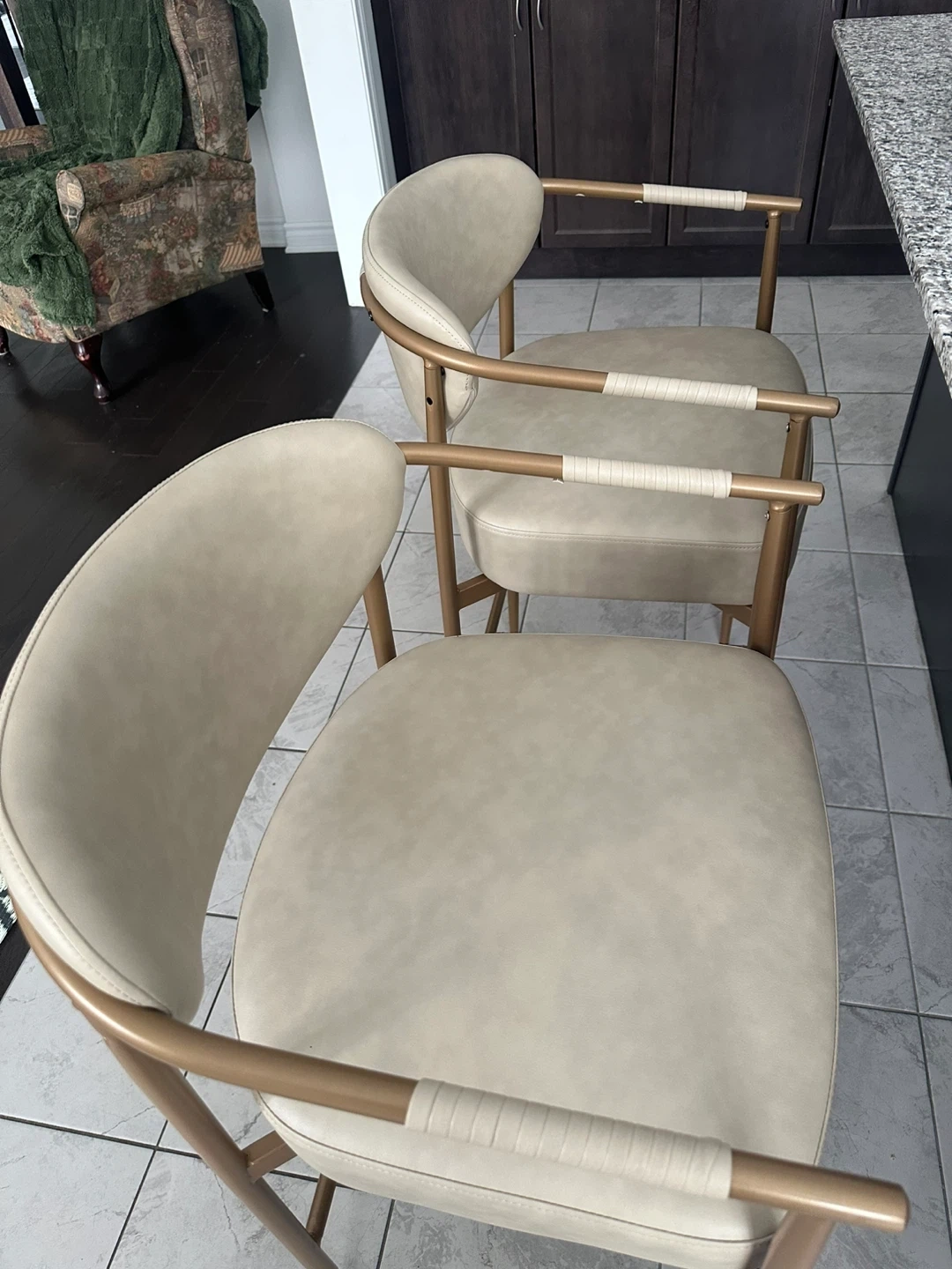 Selling a set of two stylish bar stools! They feature a comfortable beige seat and a sleek gold frame. Perfect for adding a touch of elegance to your kitchen or bar area. They are in great condition and ready for a new home!