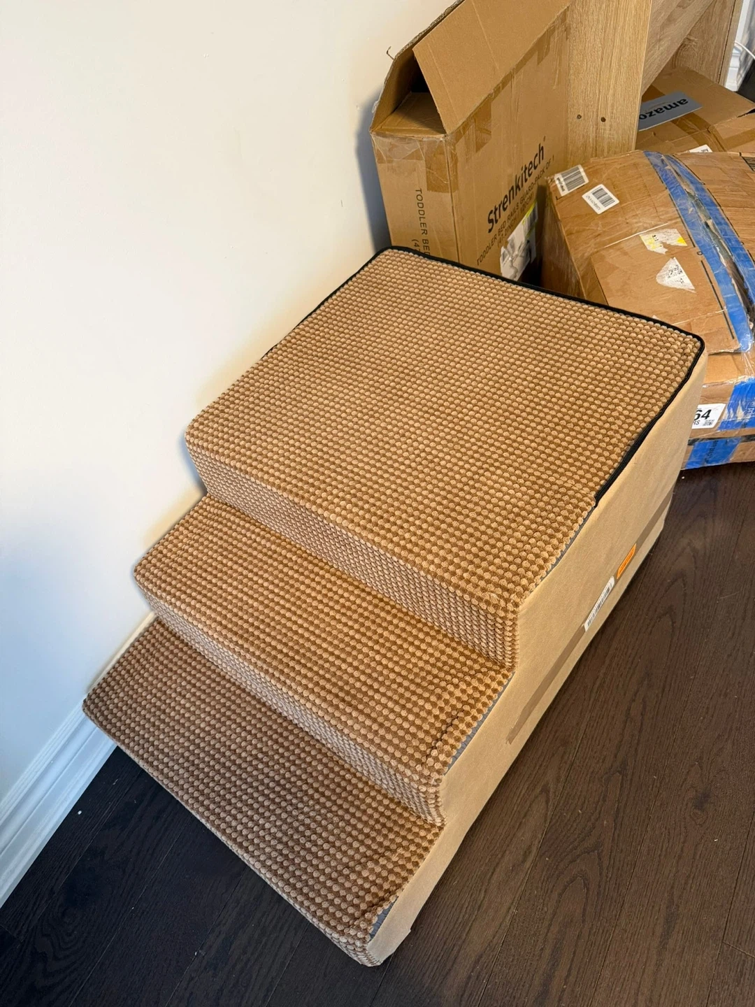 These carpeted pet stairs are perfect for helping your furry friend reach higher places! The stairs have three steps and are in great condition. They are sturdy and covered with a soft, textured carpet for your pet's comfort