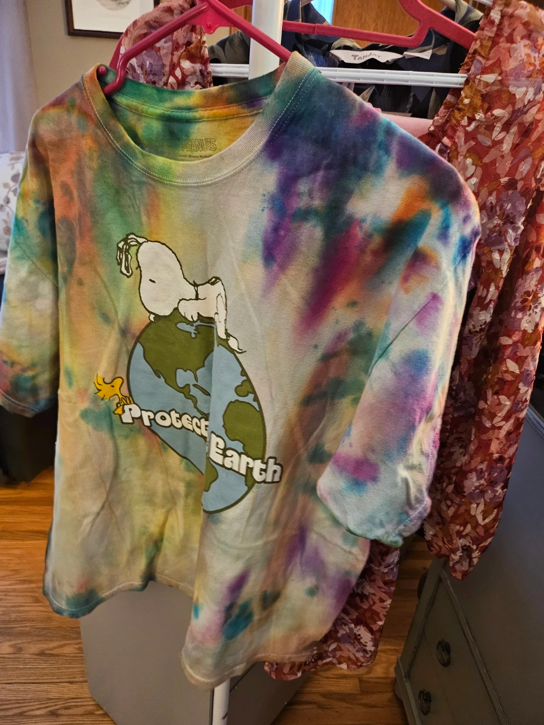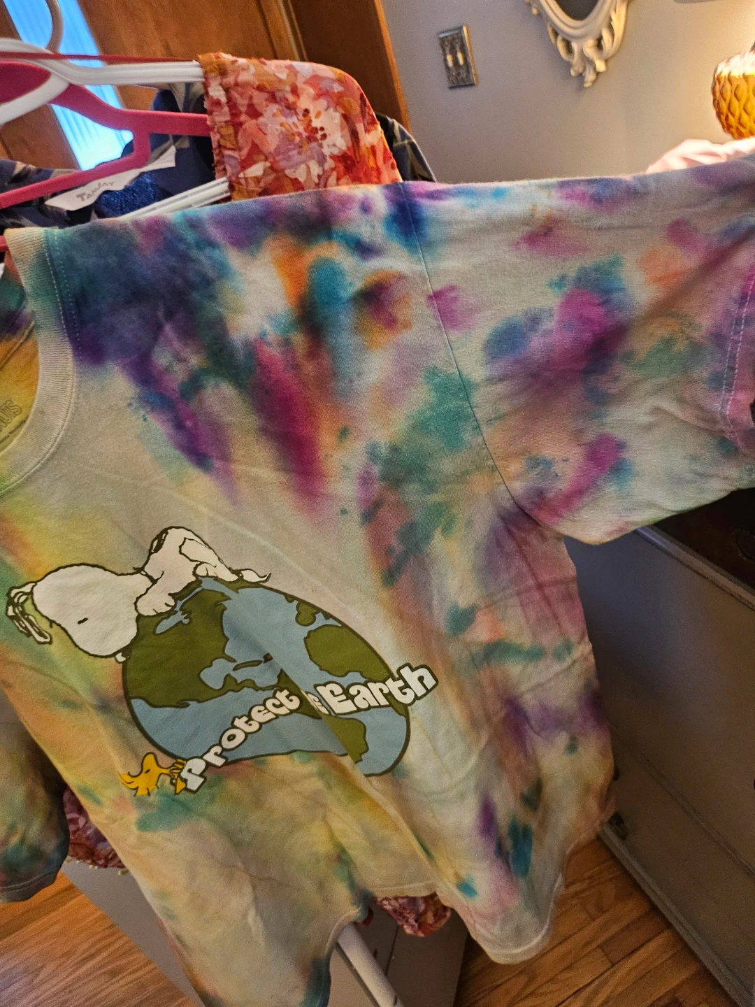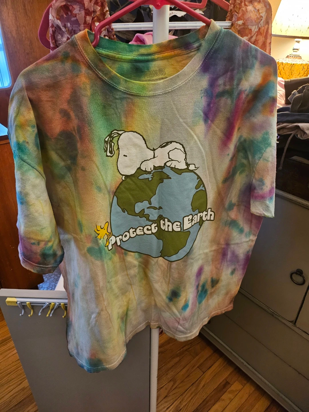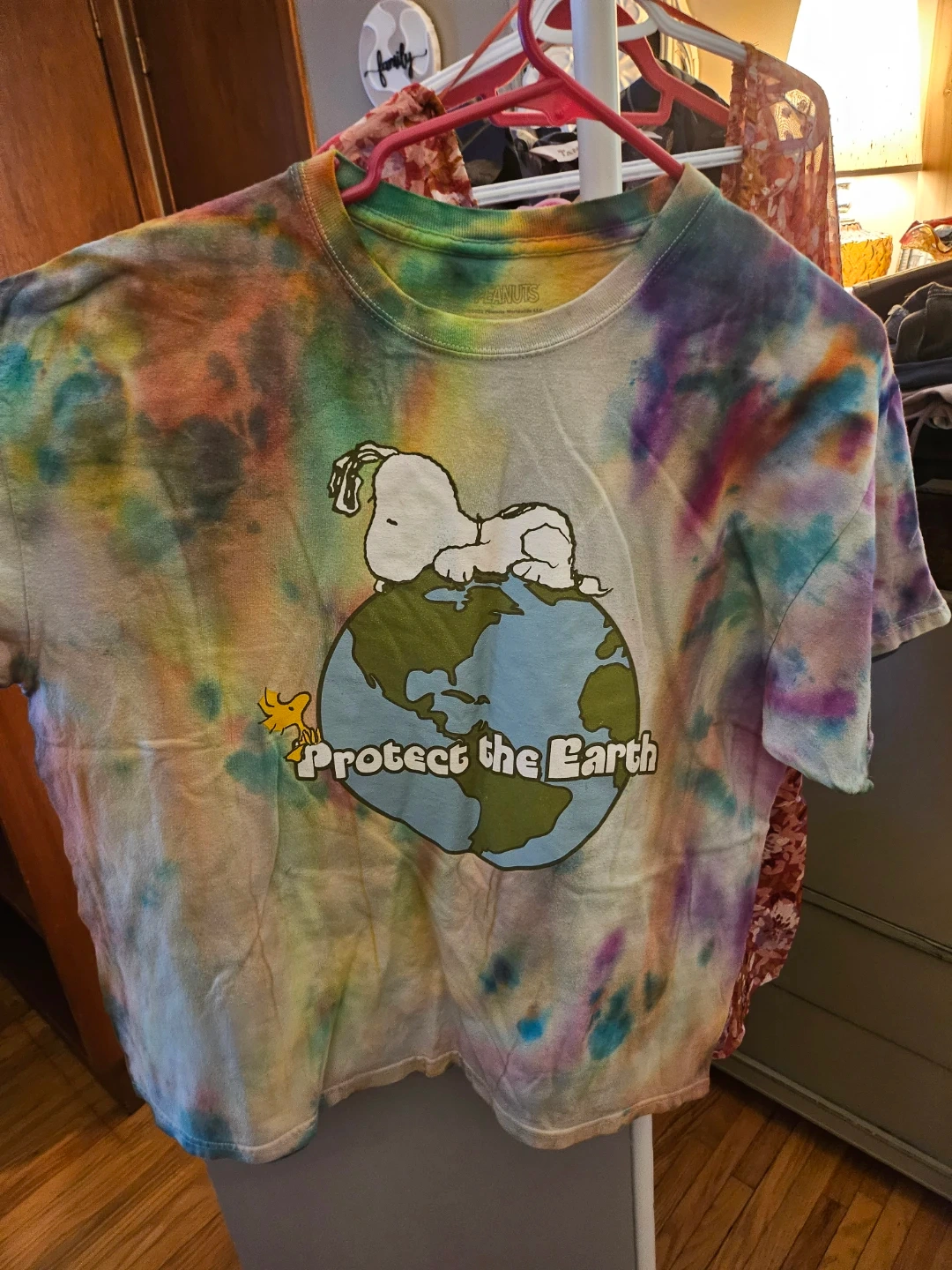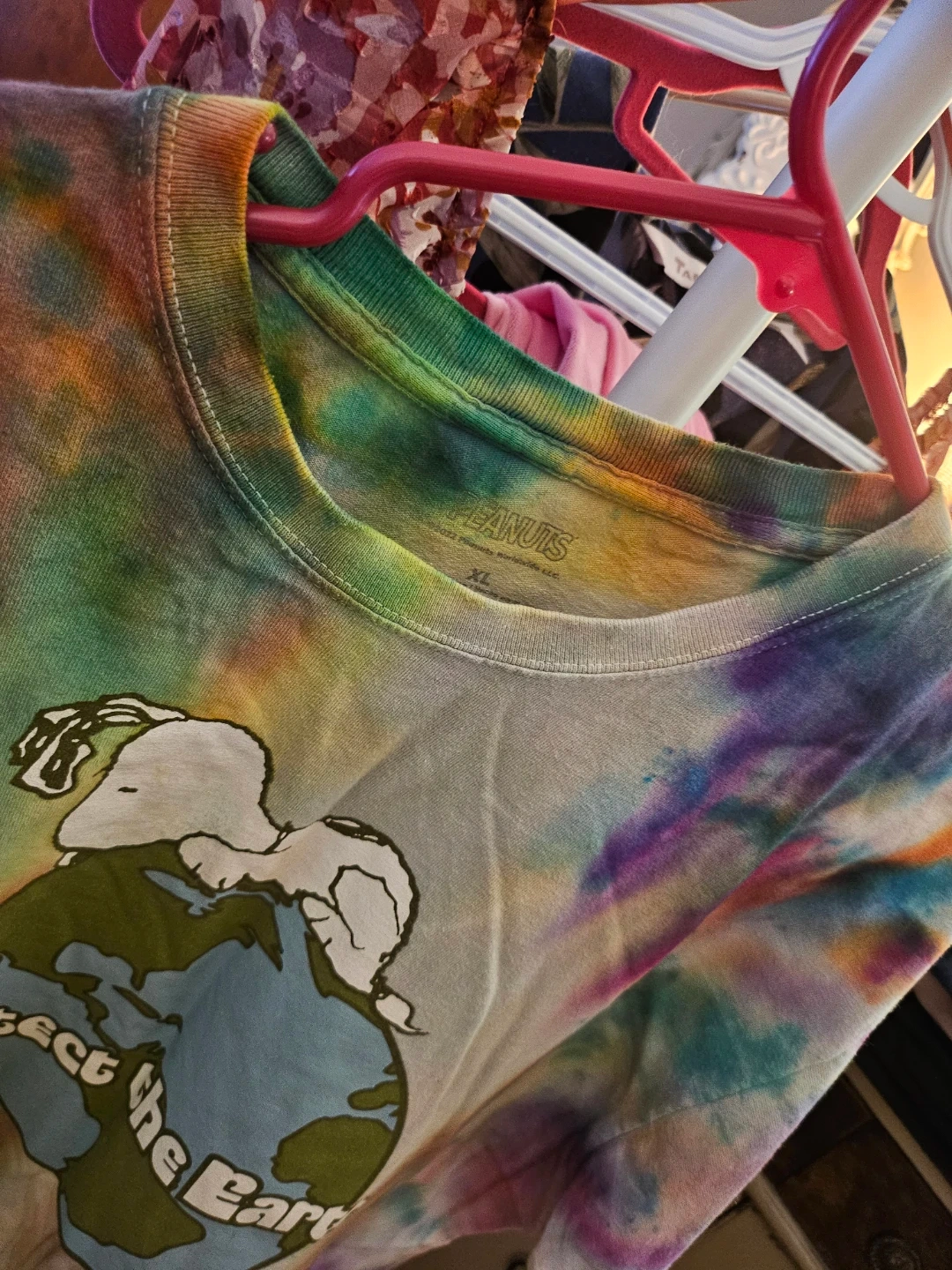 Selling a Peanuts tie-dye t-shirt in size XL! The shirt features Snoopy and the words "Protect the Earth". It's made of 100% cotton and has a colourful tie-dye pattern. Perfect for any Peanuts fan!