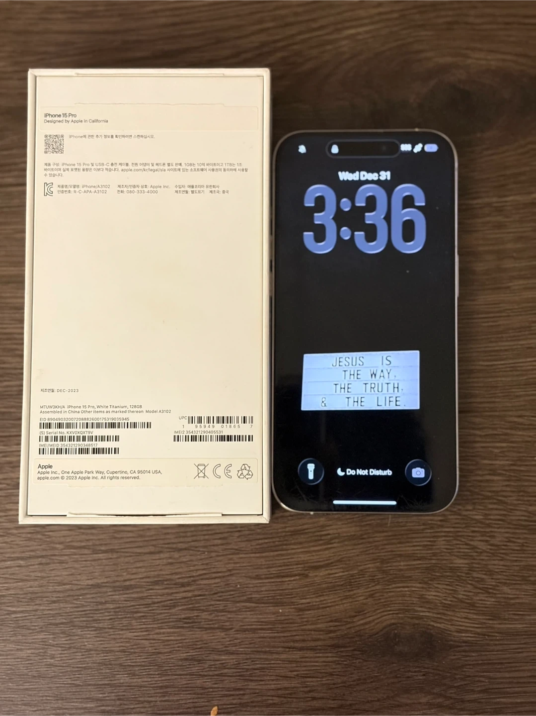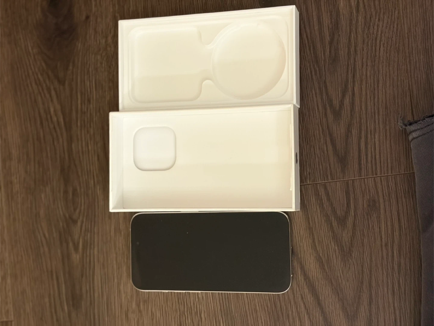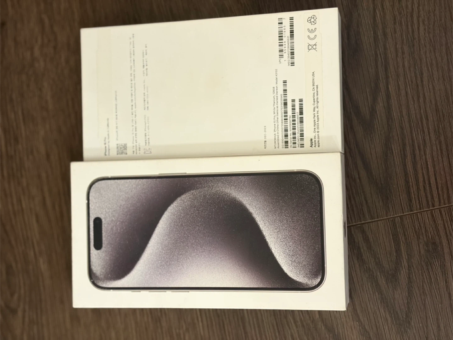 Selling an iPhone 15 Pro in White Titanium with 128GB of storage. It comes with the original box. There are some scratches on the screen, as shown in the photos.