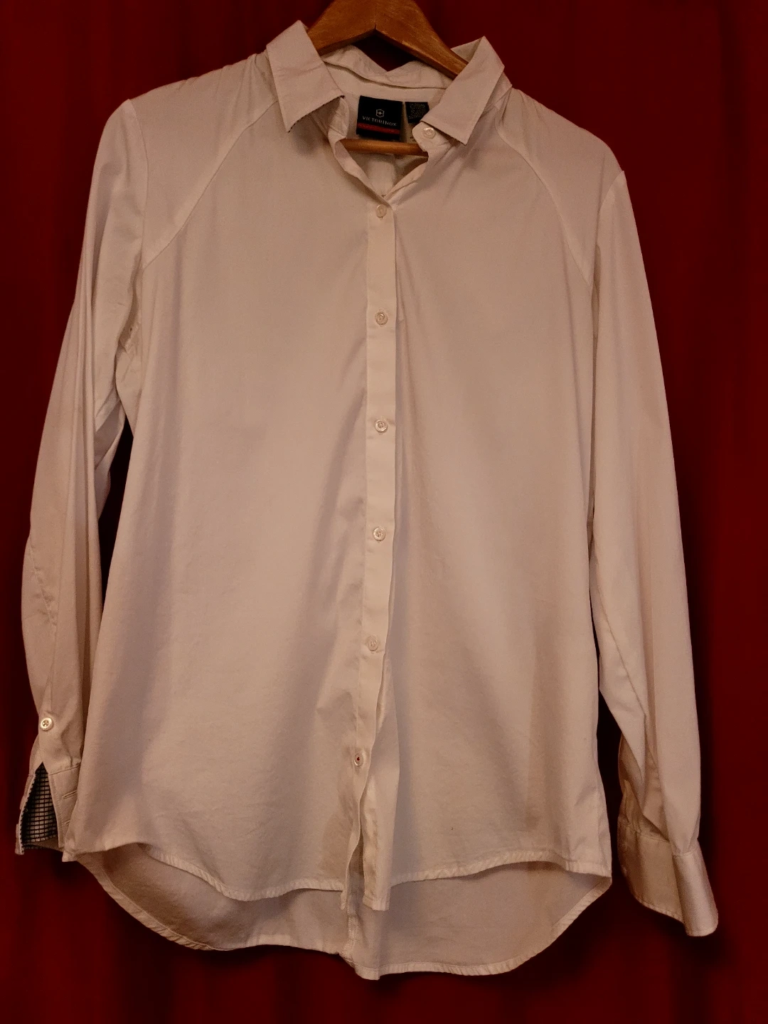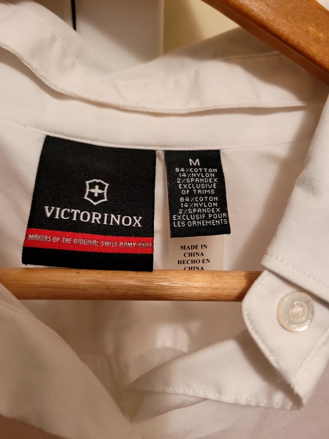 Selling a Victorinox button-down shirt in white. It's a size M and made of 84% cotton, 14% nylon, and 2% spandex. Perfect for a casual or professional look!