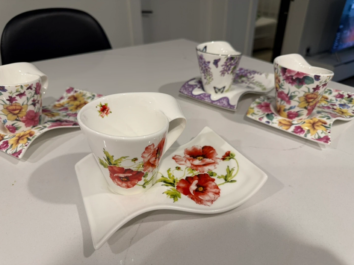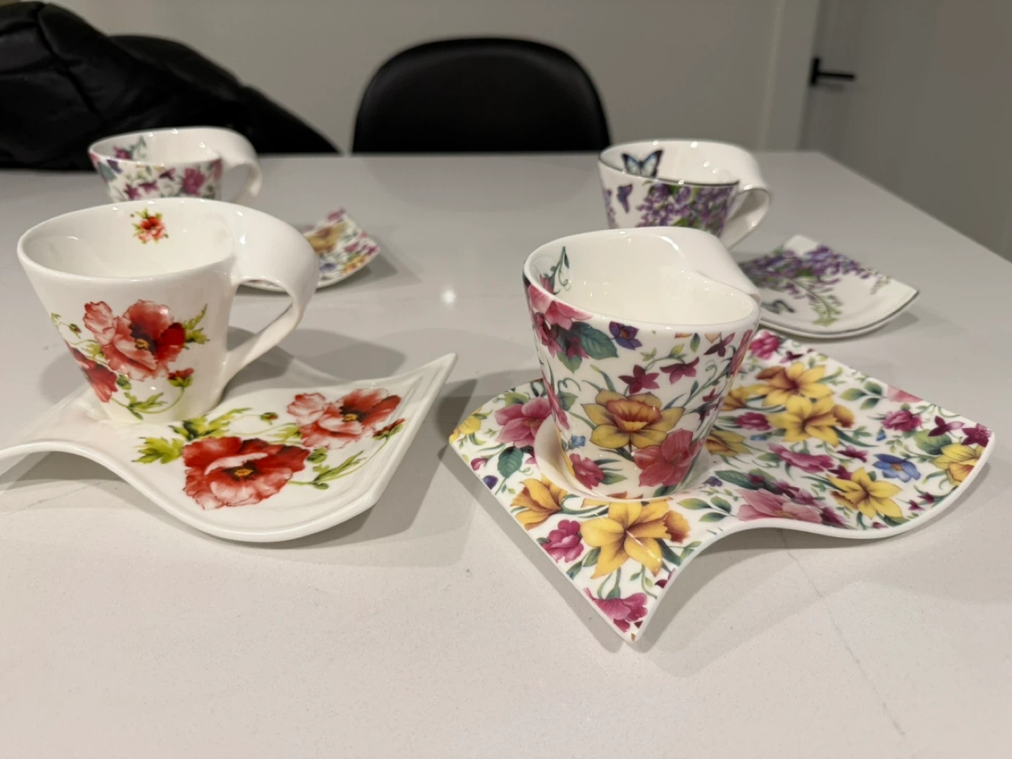 Selling a set of 4 floral tea cups with matching saucers. They feature different floral patterns and a unique, modern design. Perfect for tea time or adding a touch of elegance to your kitchen!