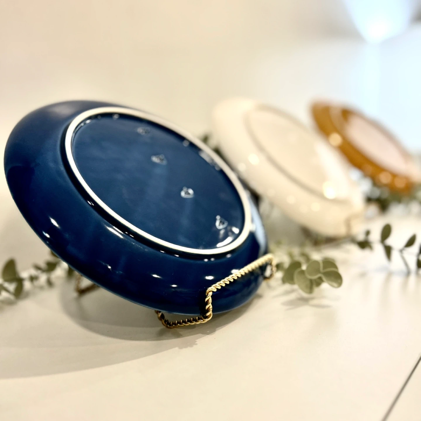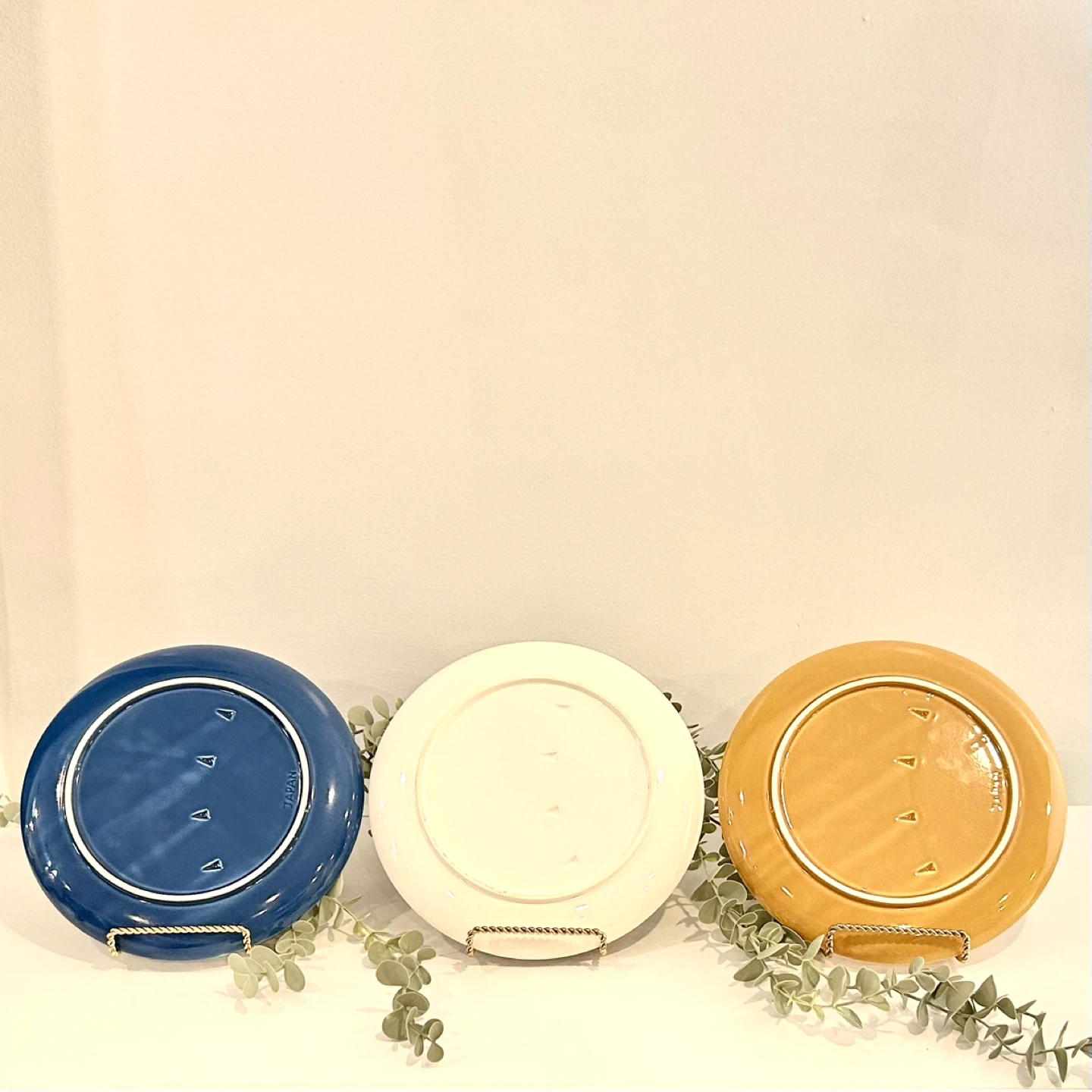 The set includes three matching plates in coordinated glazes: