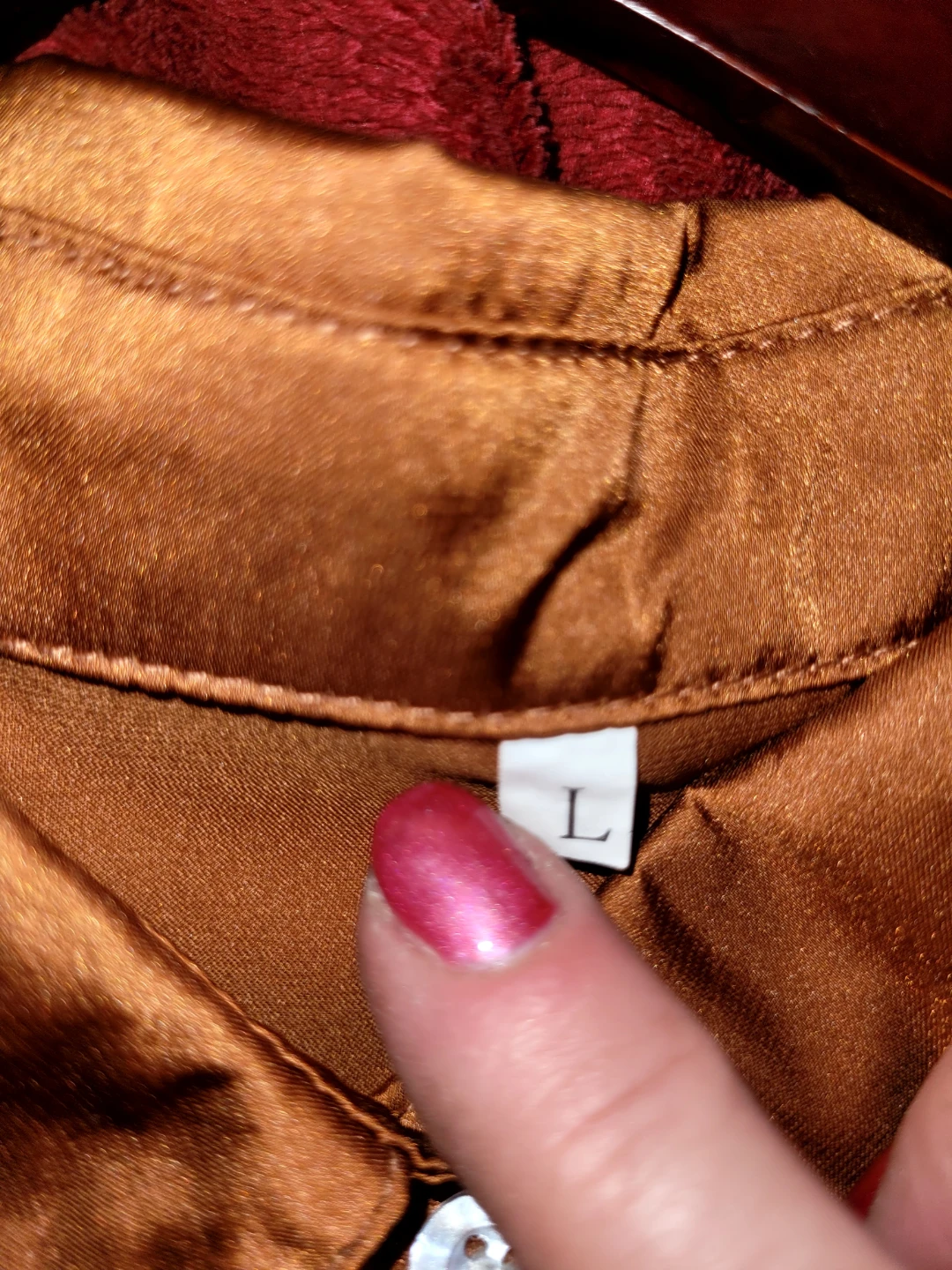 Selling a stylish brown satin button-up shirt in size L. It's in great condition and perfect for adding a touch of elegance to any outfit! The material is smooth and comfortable, making it ideal for both casual and dressier occasions