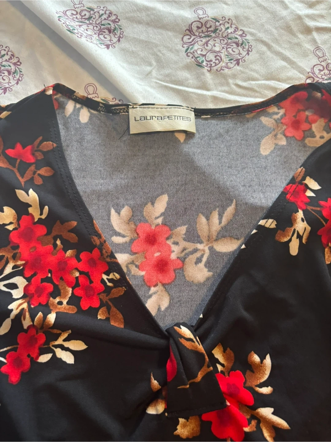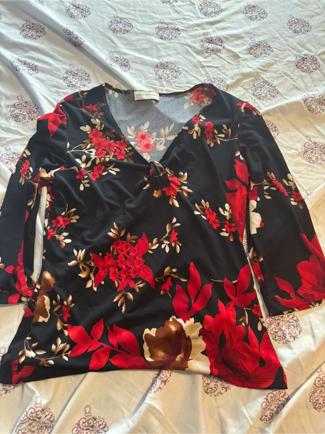 This is a Laura Petites blouse with a beautiful floral pattern! It features a V-neck and long sleeves, perfect for adding a touch of elegance to your wardrobe