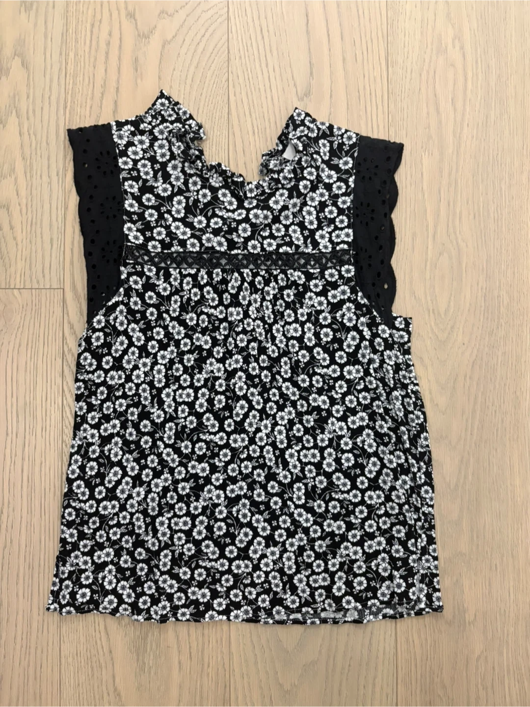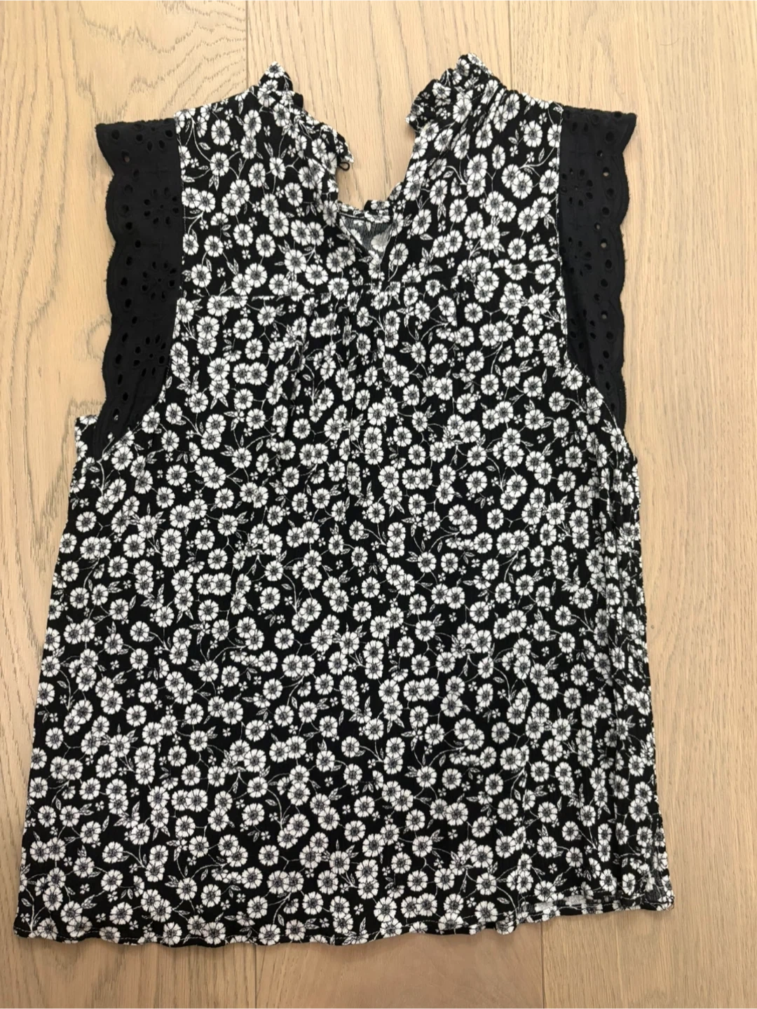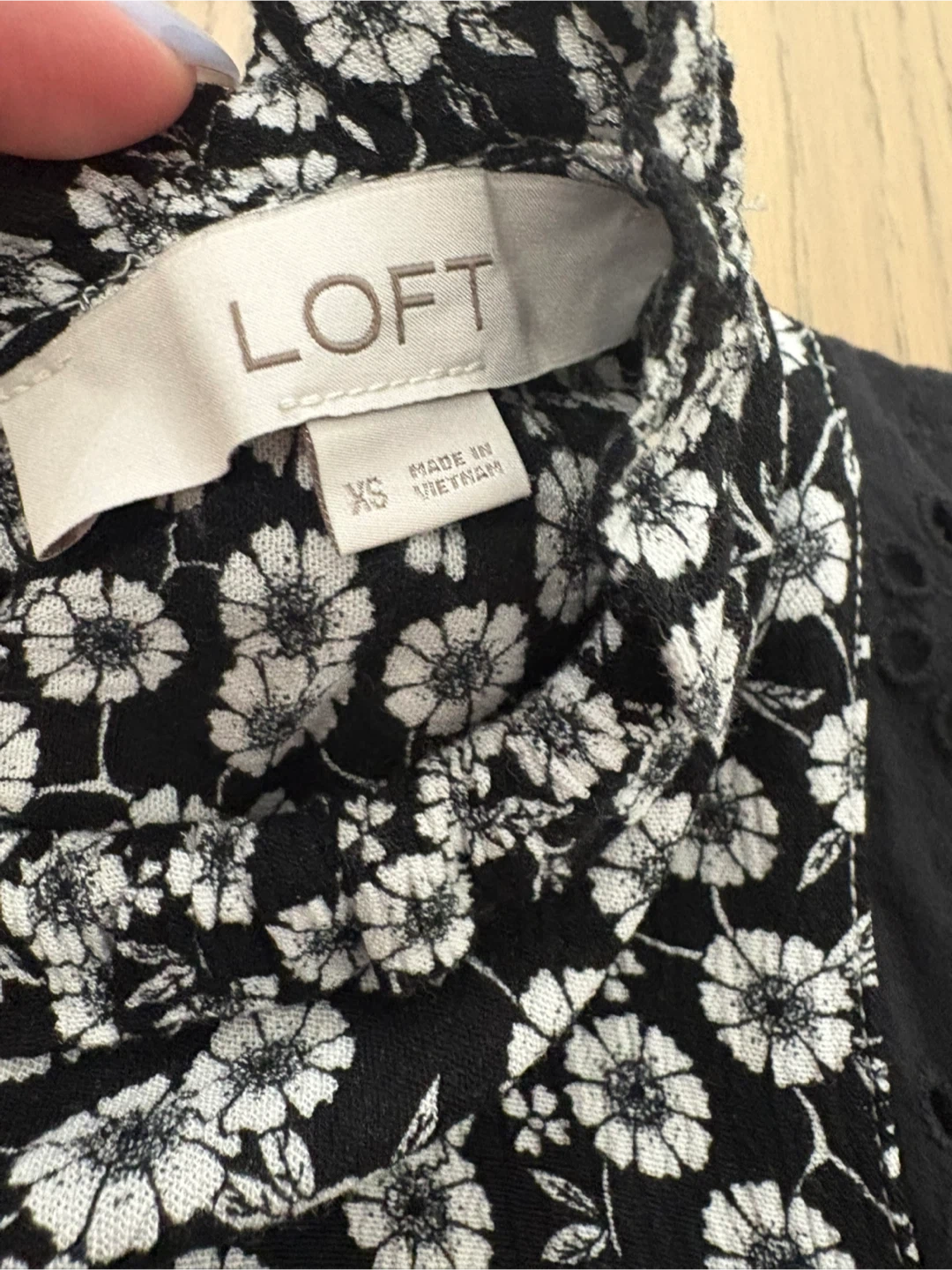 A cute LOFT blouse in size XS! It features a black and white floral pattern with eyelet detailing on the sleeves. Perfect for a casual or dressed-up look!