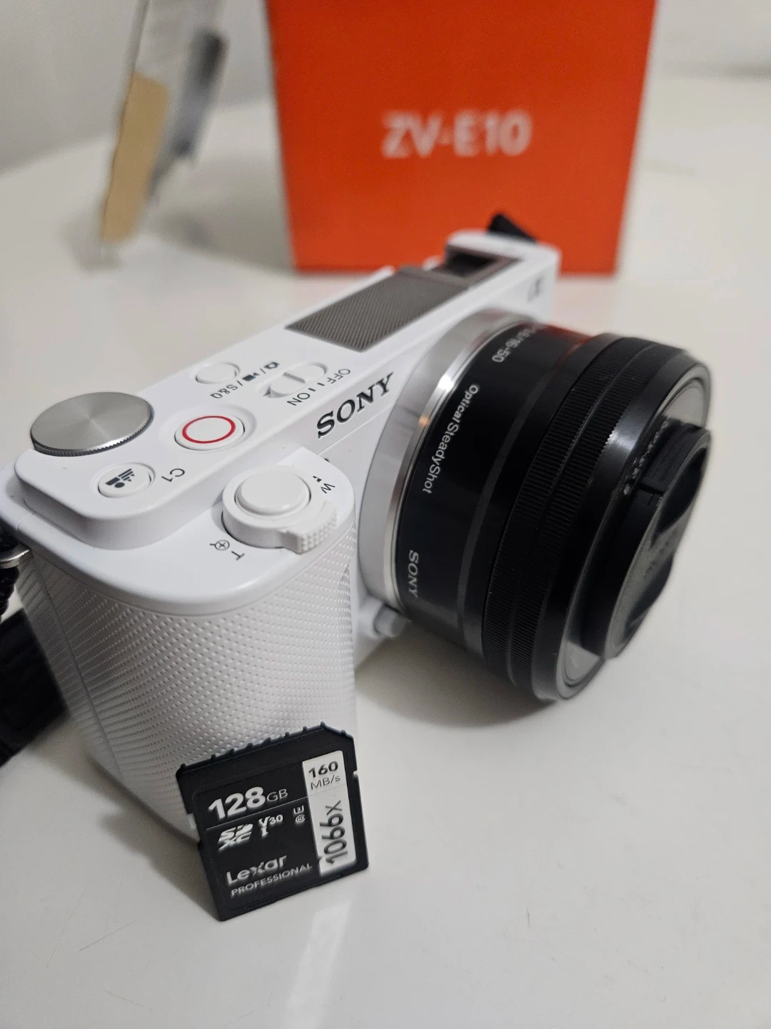 Selling a like-new Sony ZV-E10 camera in white! It comes with a Lexar Professional 128GB memory card. The shutter count is only 38, so it's barely been used. Comes with the box too!
