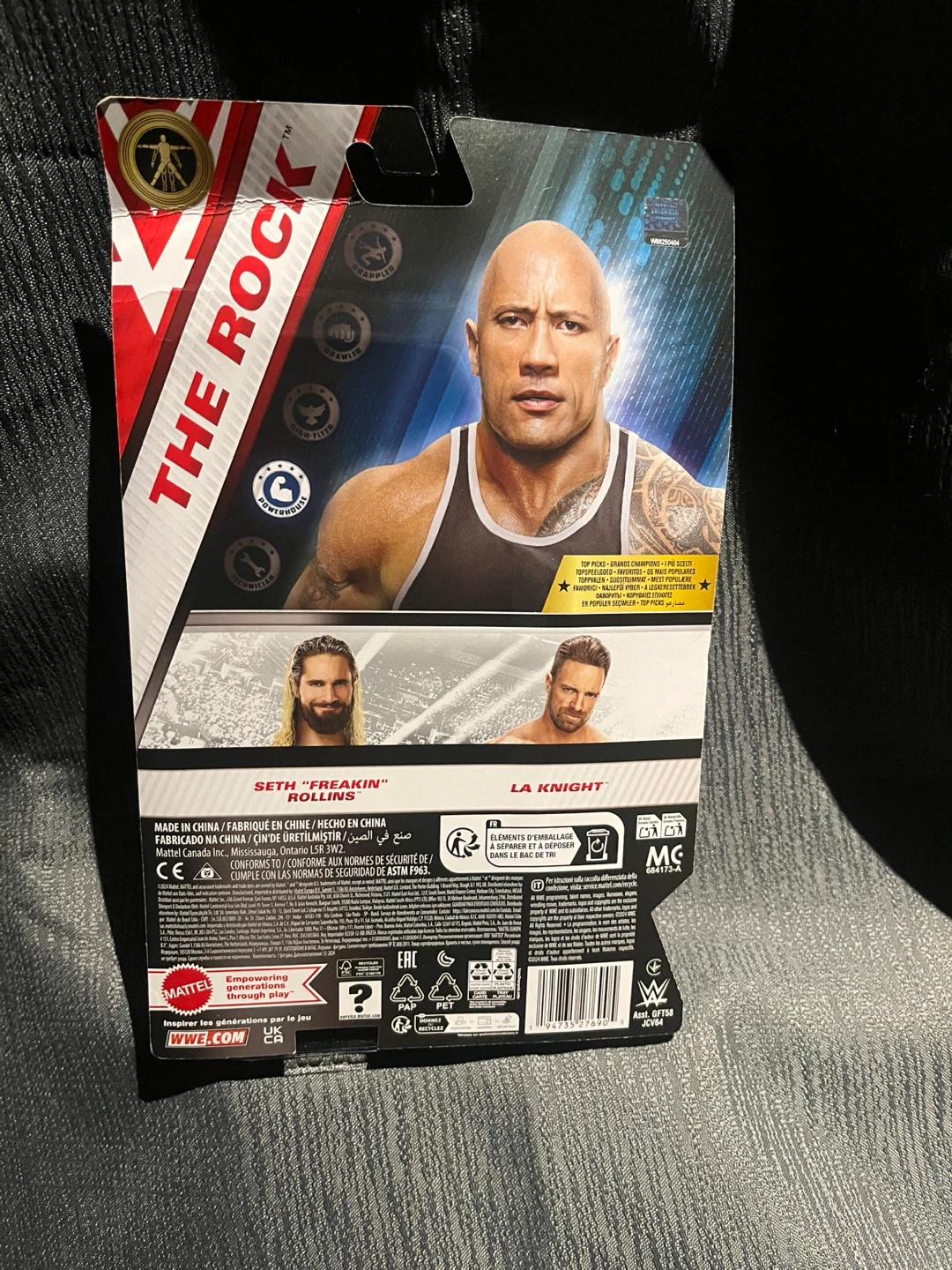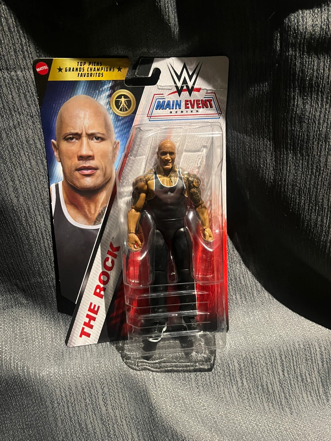 Selling a WWE Main Event Series action figure of The Rock! It's still in its original packaging, so it's in new condition
