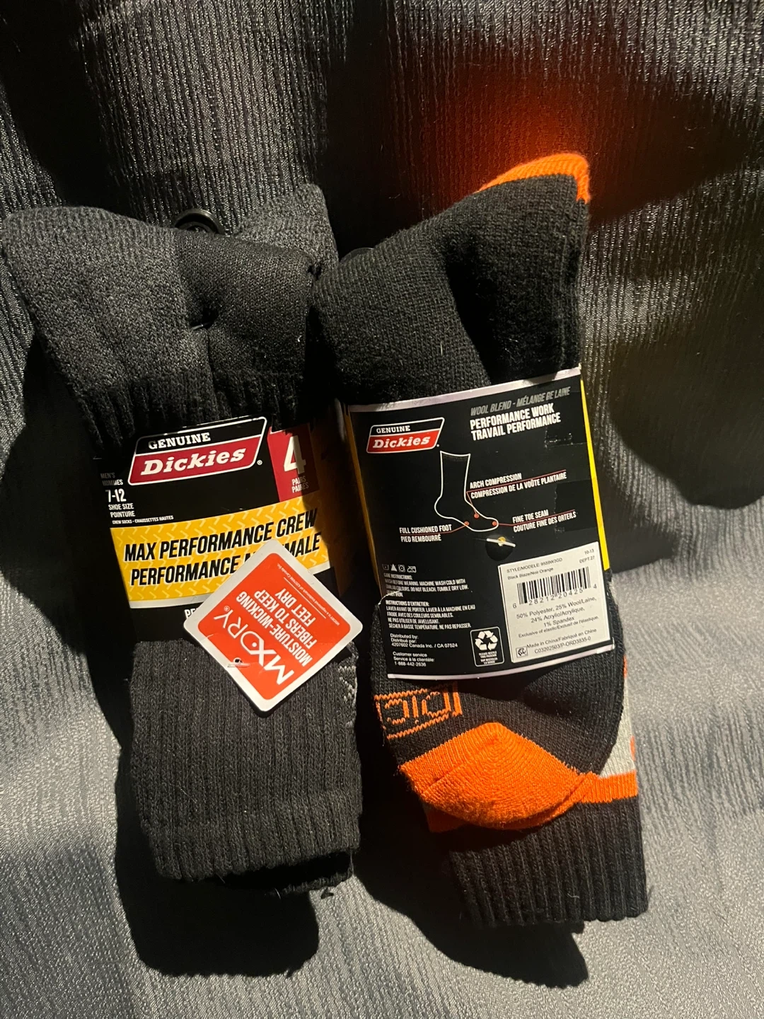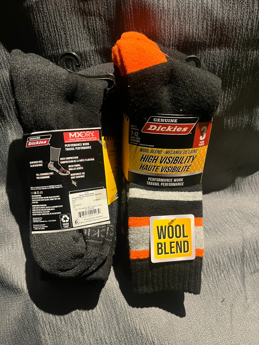 Two packs of Dickies work performance socks! One pack is a wool blend, high visibility, and size 7-12. The other pack is a max performance crew sock, also size 7-12