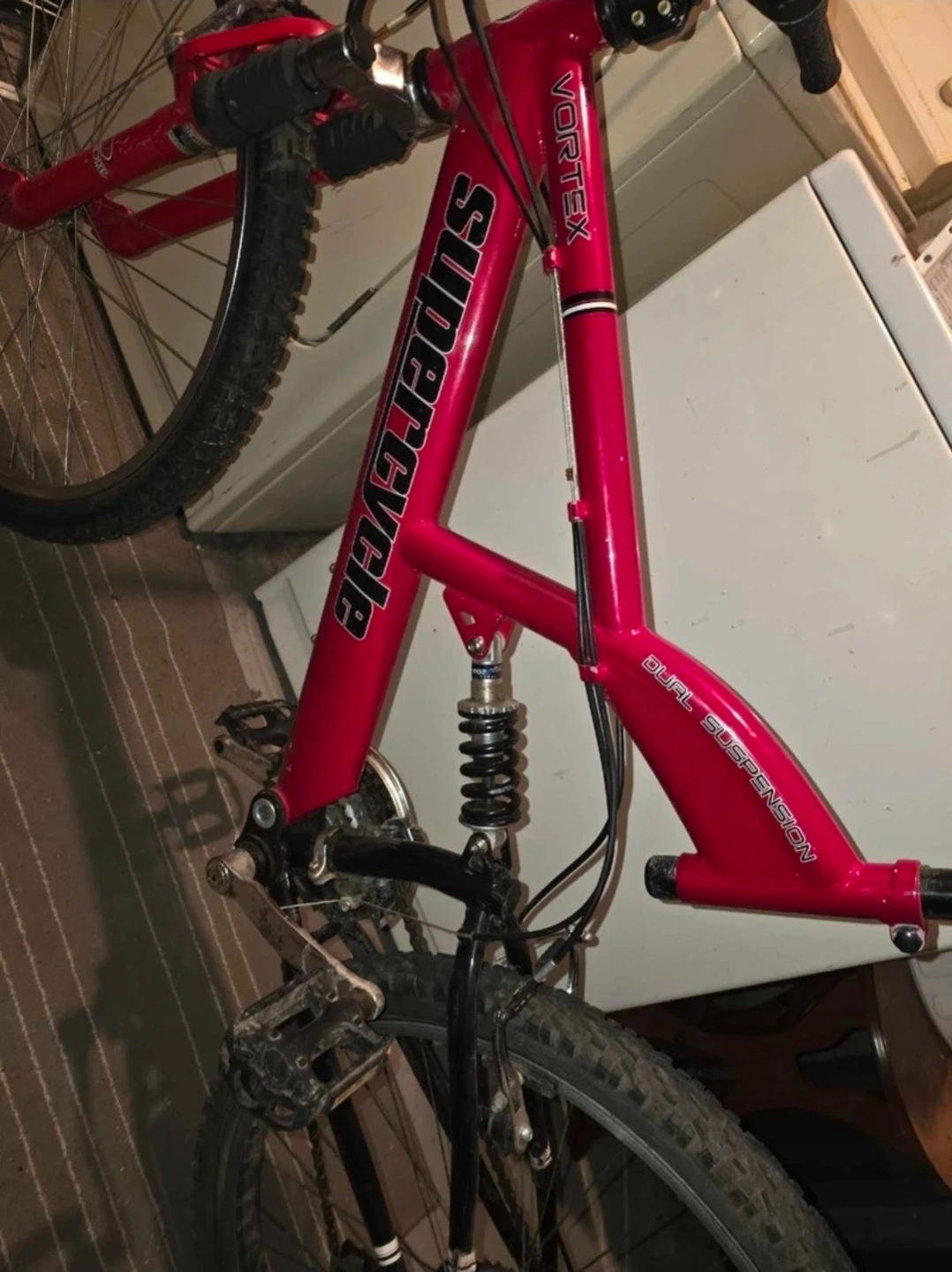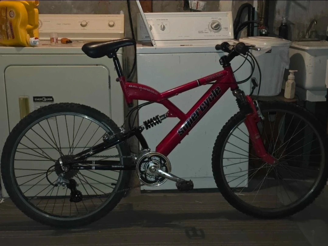 Trying to think out my collection, ready to ride supercycle vortex dual suspension mountain bike. Good for someone up to 5'10. Newer tires, asking $125 obo please check my other adds for more bikes!